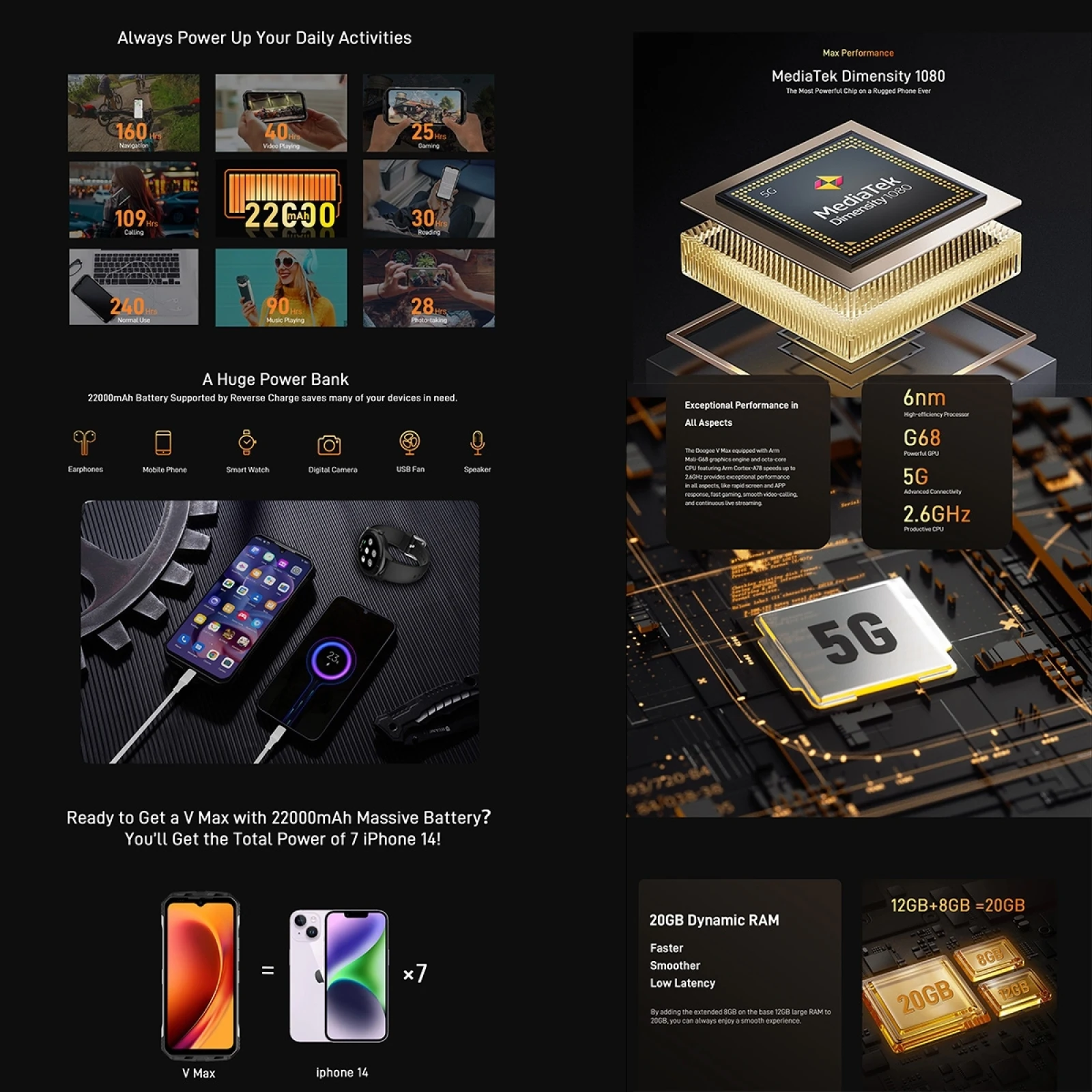 DOOGEE V Max 5G Rugged Phone 108MP Camera Night Vision 20GB 256GB Cell Phone 22000 mAh 120Hz Dimensity 1080 NFC OTG Smartphone