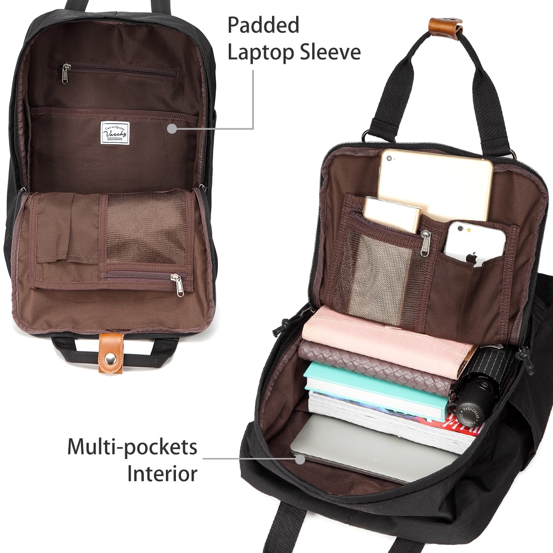• ★VINTAGE DESIGN: The Vaschy daily casual backpack is made of high quality water resistant soft durable Vinylon fabric.The vintage design features a rectangle, streamlined shape with two top handles for hand toting and adjustable backpack straps that make it easy and comfortable to carry.There are two water bottle pockets on both sides for keeping the water bottle and umbrella.
