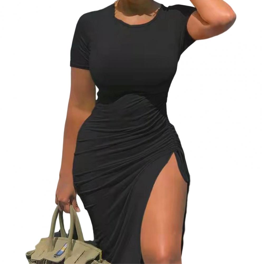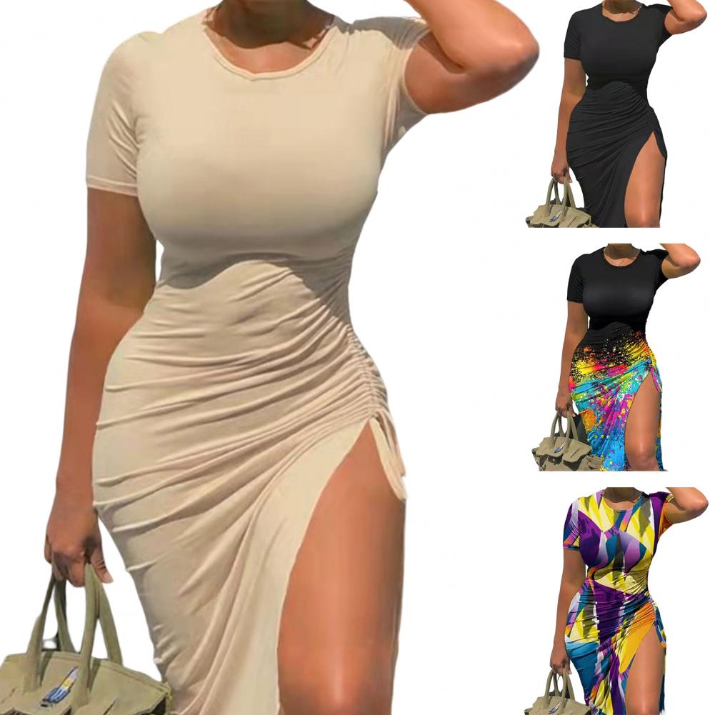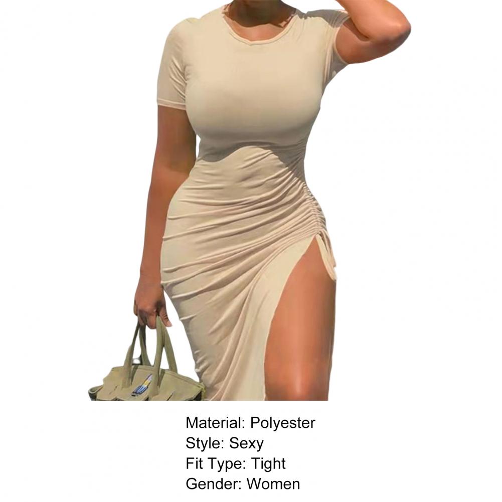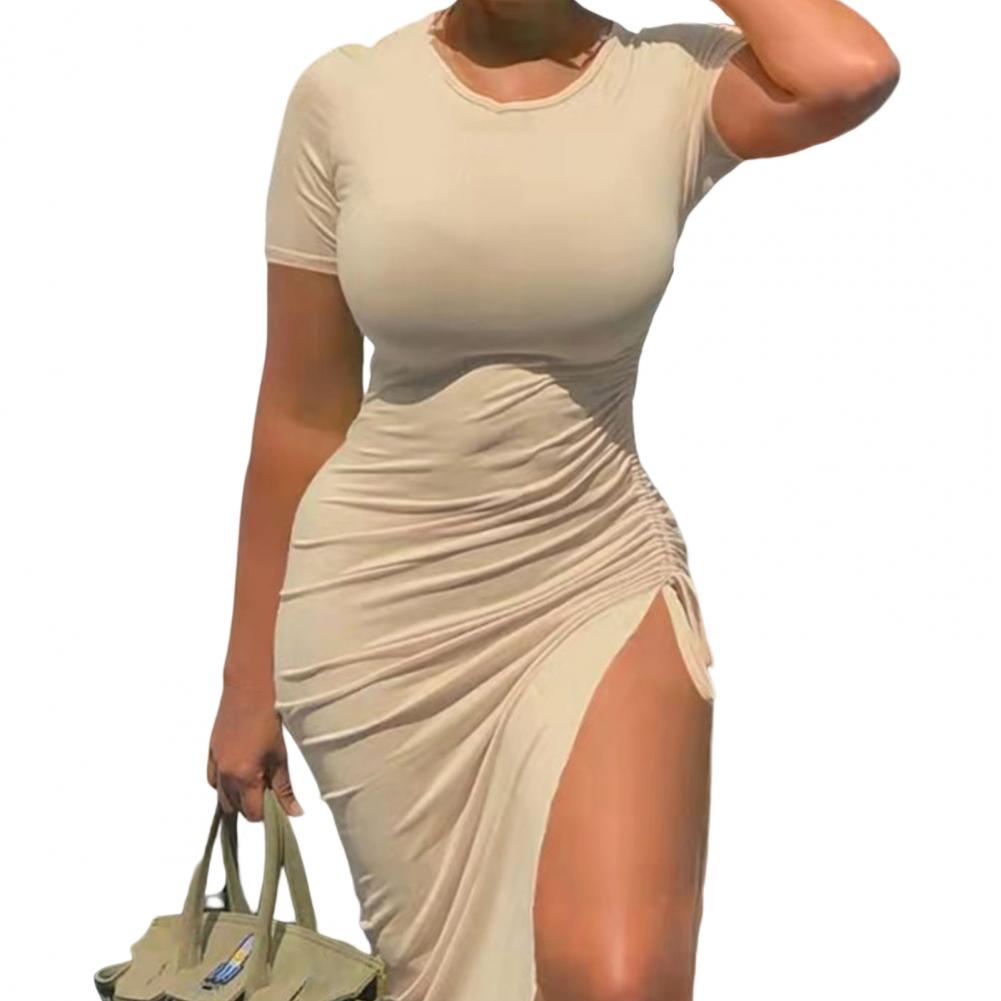 40%HOT Lady Sheath Dress Bodycon O Neck Pleated Drawstring Sheath Dress Clubwear
