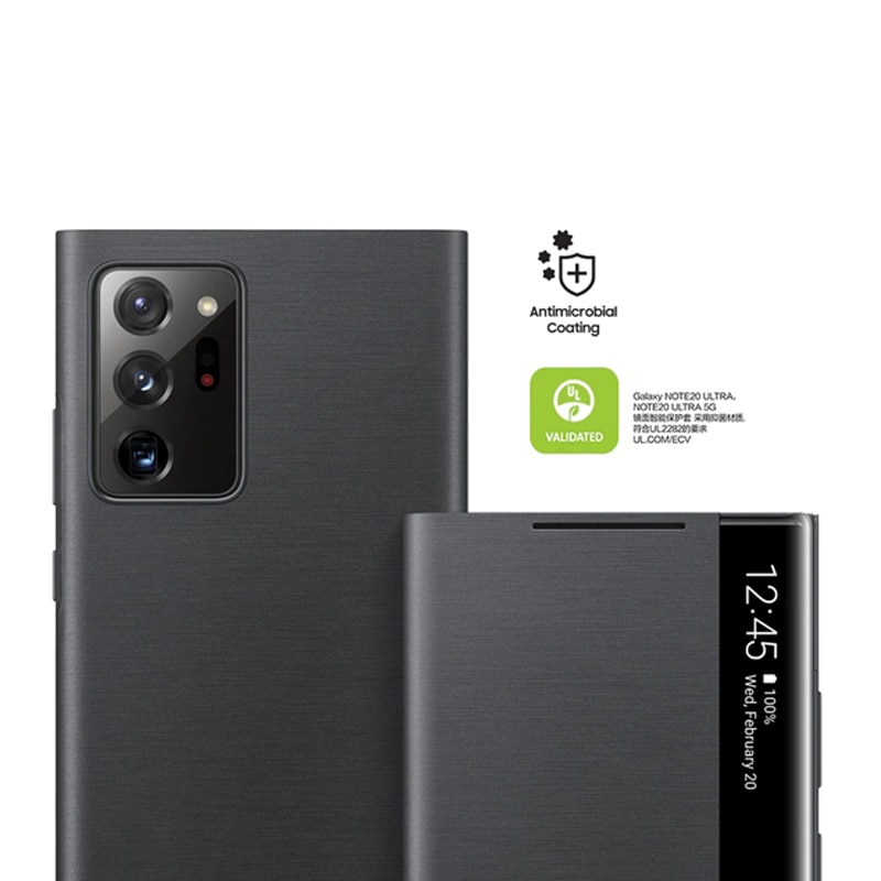 With the Samsung Galaxy Note20 Ultra 5G S-View Flip Cover, tap and swipe to control your phone, without even opening the phone case. Respond to incoming phone calls, alarms and events even while still protecting the screen. With a lower profile design, the time and your notifications are just a glance away. Antimicrobial property is applied as a coating to protect the phone cover.