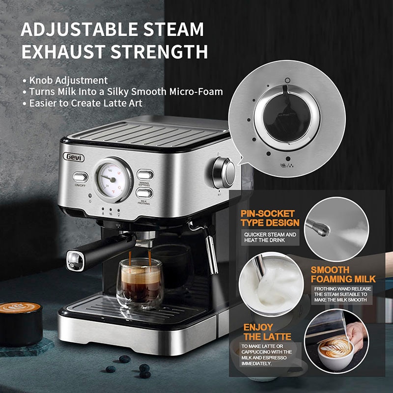 Gevi Espresso Machine 15Bar Coffee Machine Semi-automatic Household Coffee Maker with Foaming Milk Frother Wand 1100W GECME403-U
