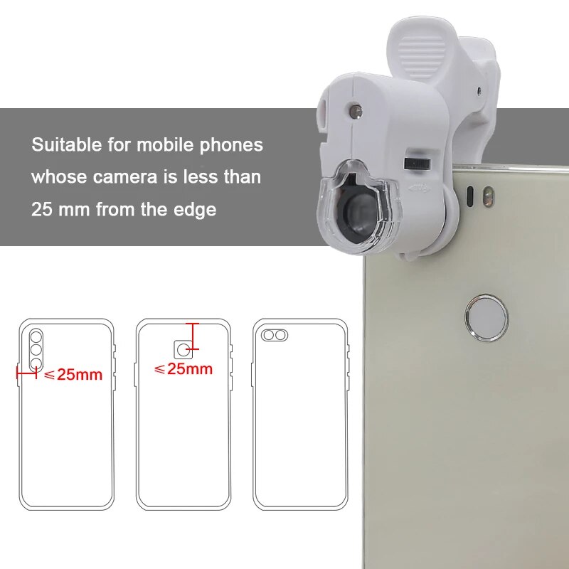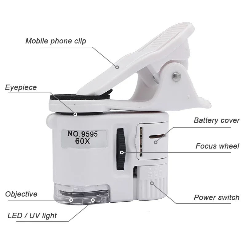 Universal Clip Microscope 60X LED Jewelry Magnifying Glass Focusing Adjusted Pocket Microscope with Cell Phone Clip UV Light