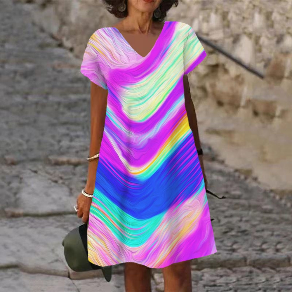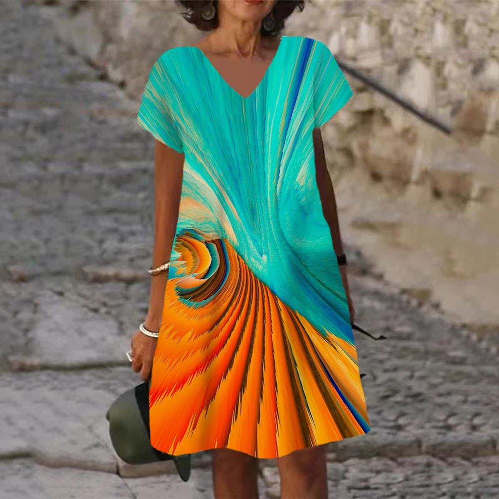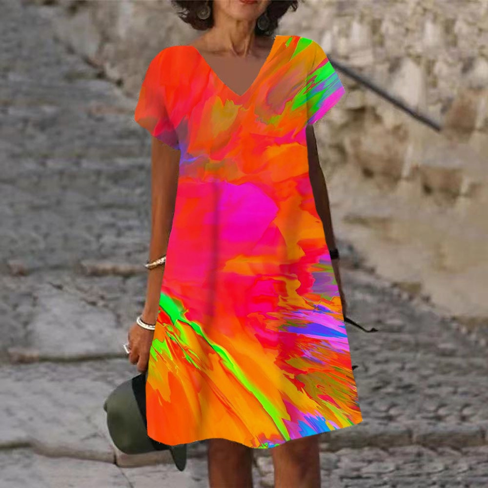 2022 summer casual women's painted print A-line dress knee-length dress V-neck loose women's new blue red purple