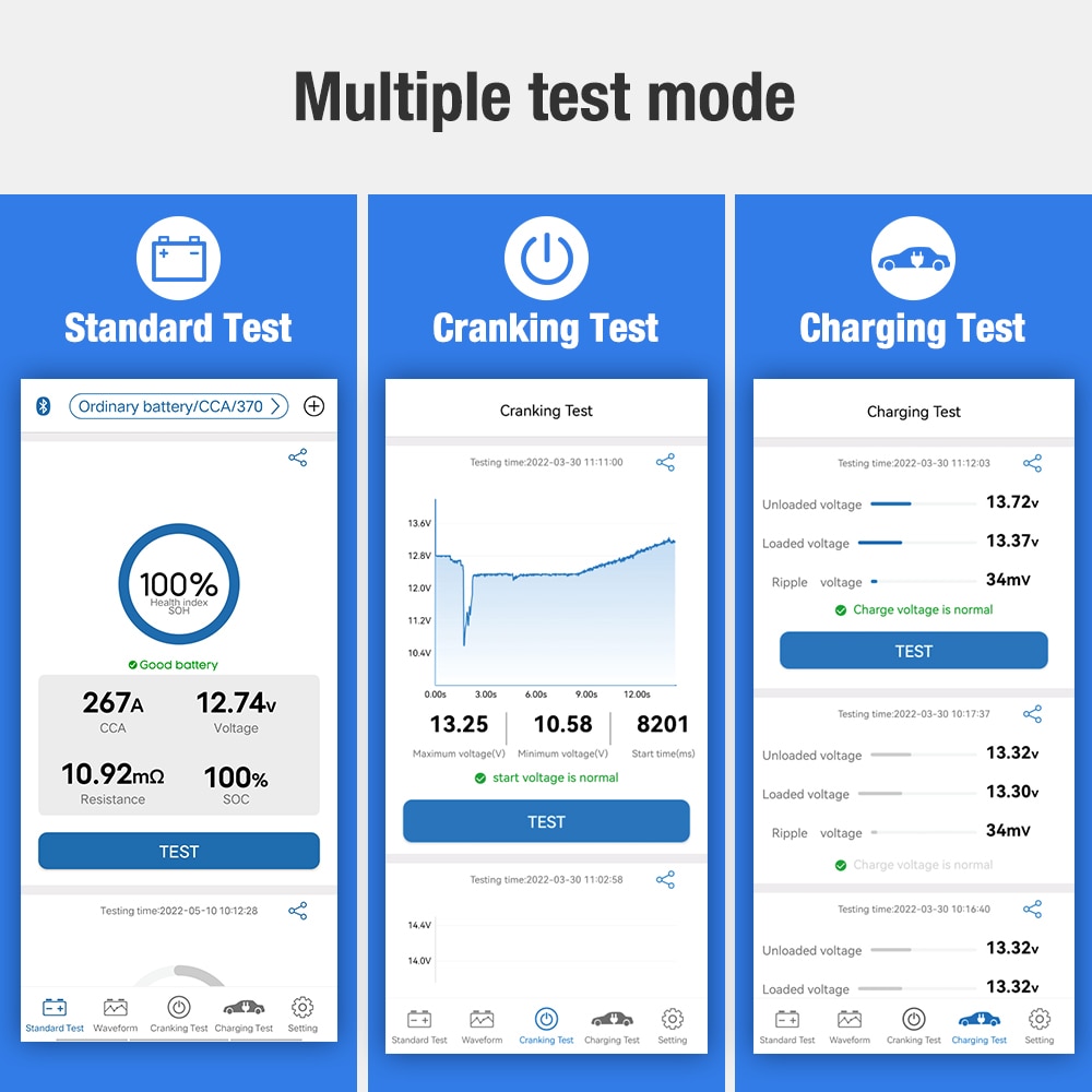 The cranking test is to test and analyze the starter motor to check if the starter motor is working properly, and the charging test is to check the state of the charging system to avoid damaging the battery. It is much more convenient than driving a few miles to a nearby auto repair store.