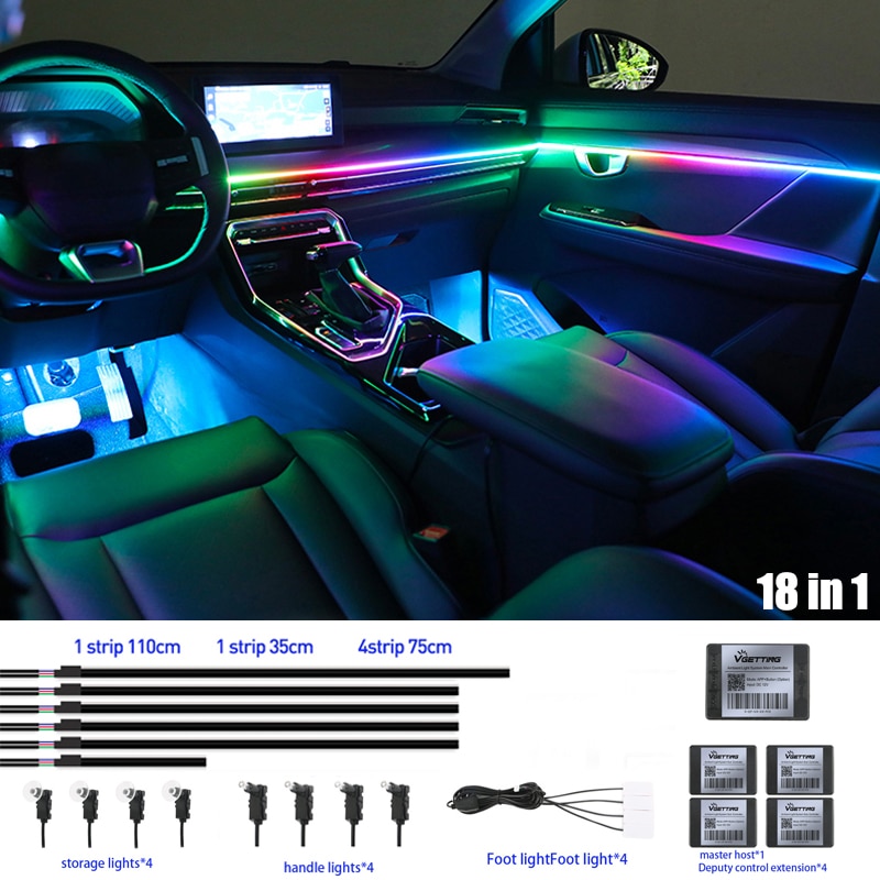 - Item Type : 18 in 1 ( 6 Pcs LED Light Strip(75cm/4 + 110cm/1 + 35cm/1) + 4*Ambient(foot) lights + 4*Handle lights+ 4*Storage lights+ 1*Main controller module + 4*Sub controller module)