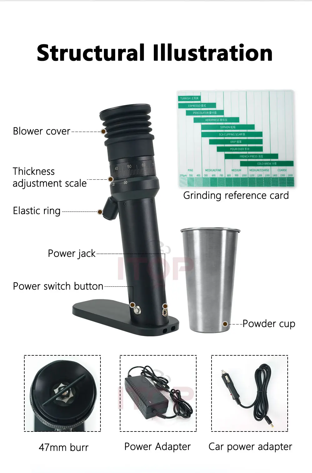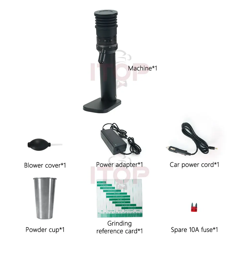 Package includes: machine, blower cover, power adapter, car power cord, powder cup, grinding reference card, spare 10A fuse.