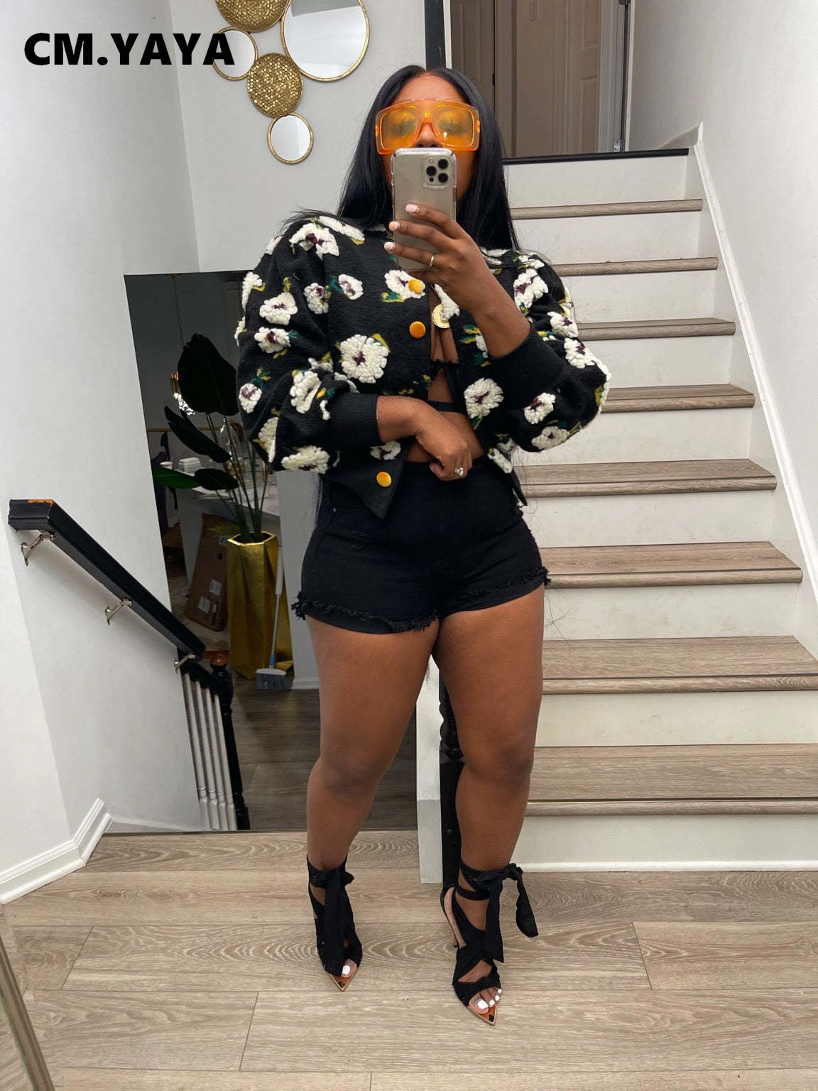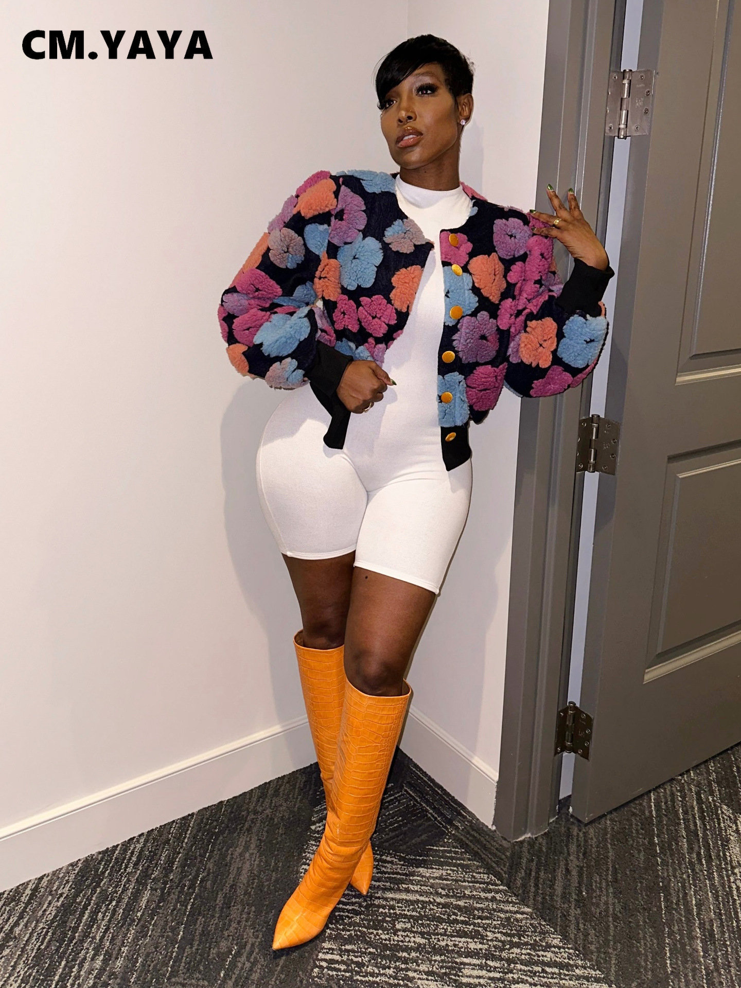 CM.YAYA Elegant Women Button Front Floral Appliques Long Sleeve Jacket Thick Warm INS 2022 Winter Streetwear Fashion Outwear