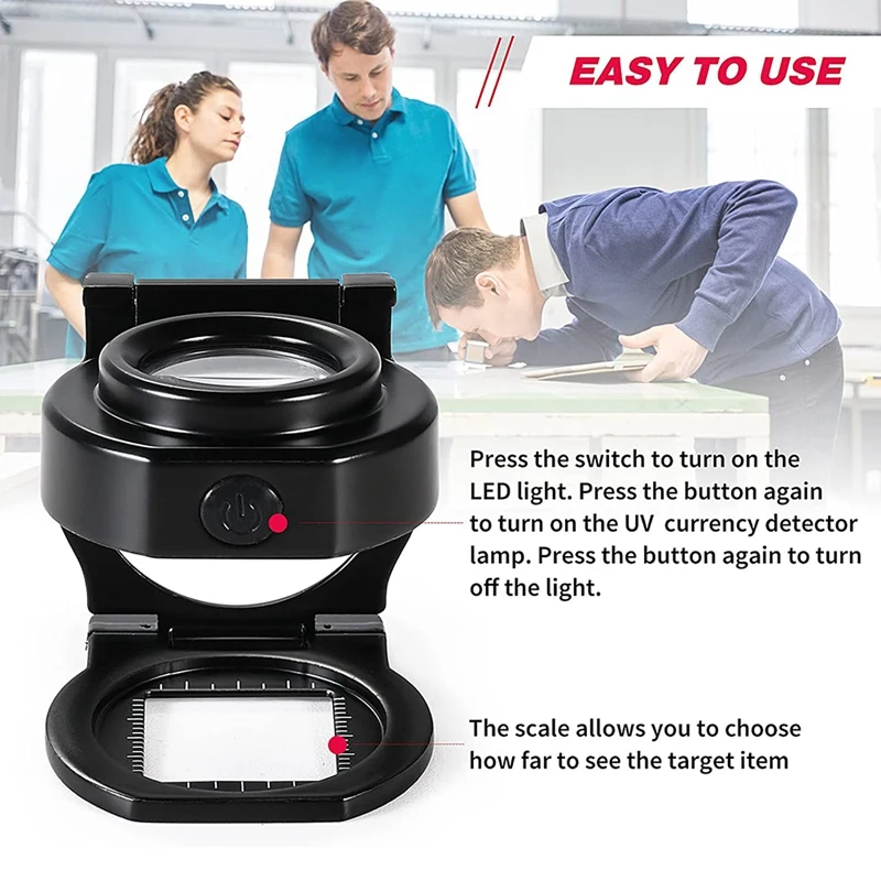 EASY TO TURN ON/OFF - Just Press down the soft silicone button to turn on the 4 white lights for usual magnified observation, press again to 2 UV lights for money detector magnifier. Press the third time to turn off the light. This small jewelers loop will be a good helper at work.