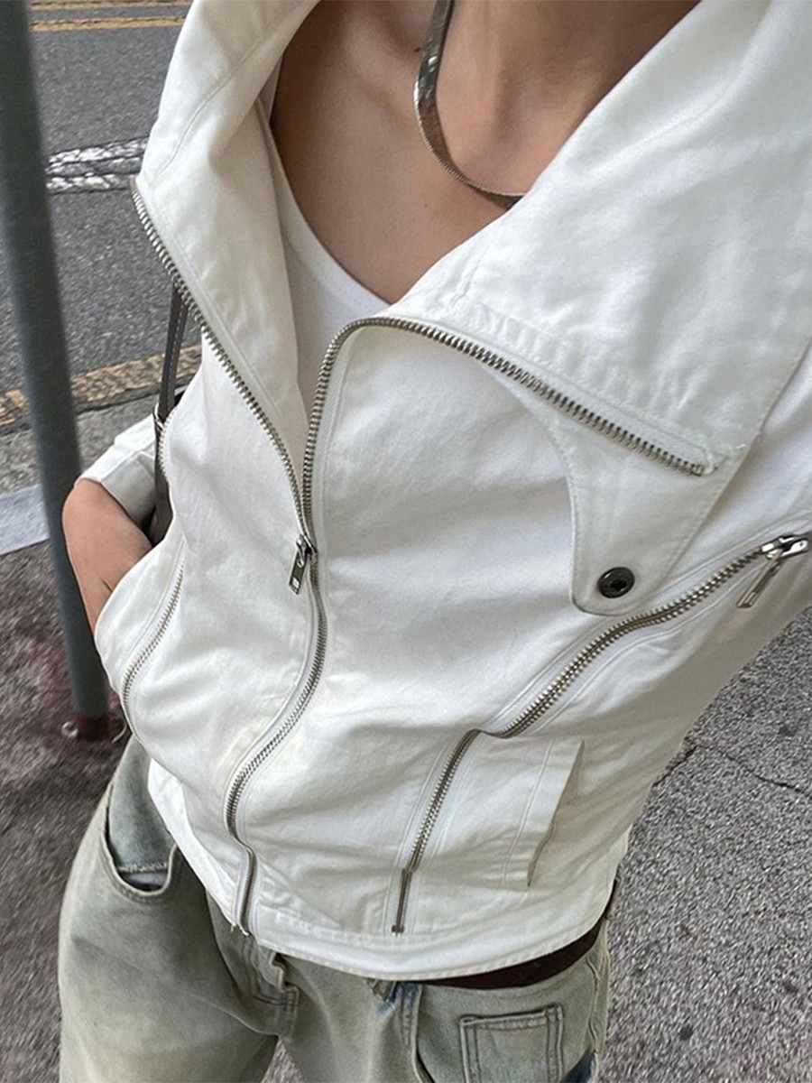 Women Casual Jacket Vintage Long Sleeve Stand Collar Zipper Closure Solid Cool Fall Outwear