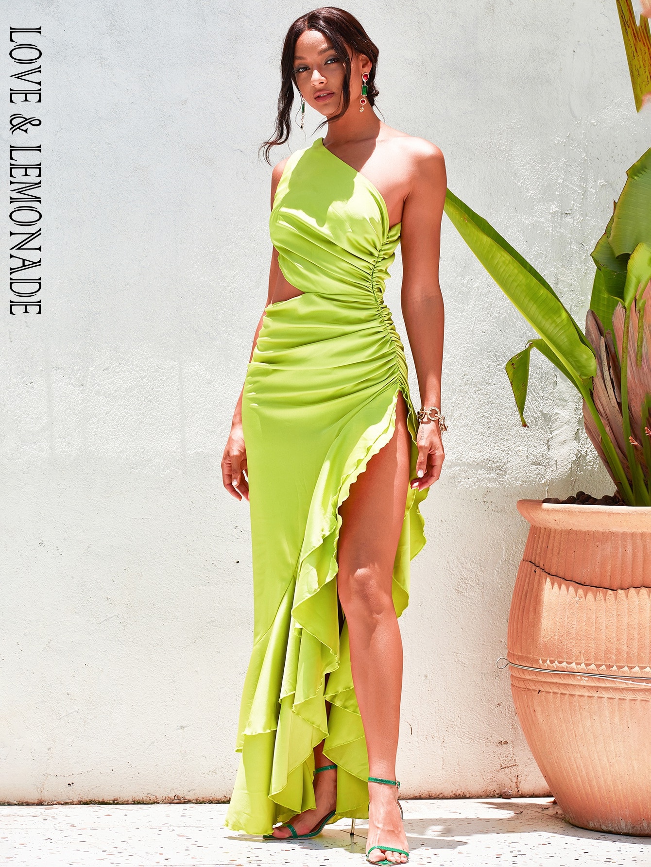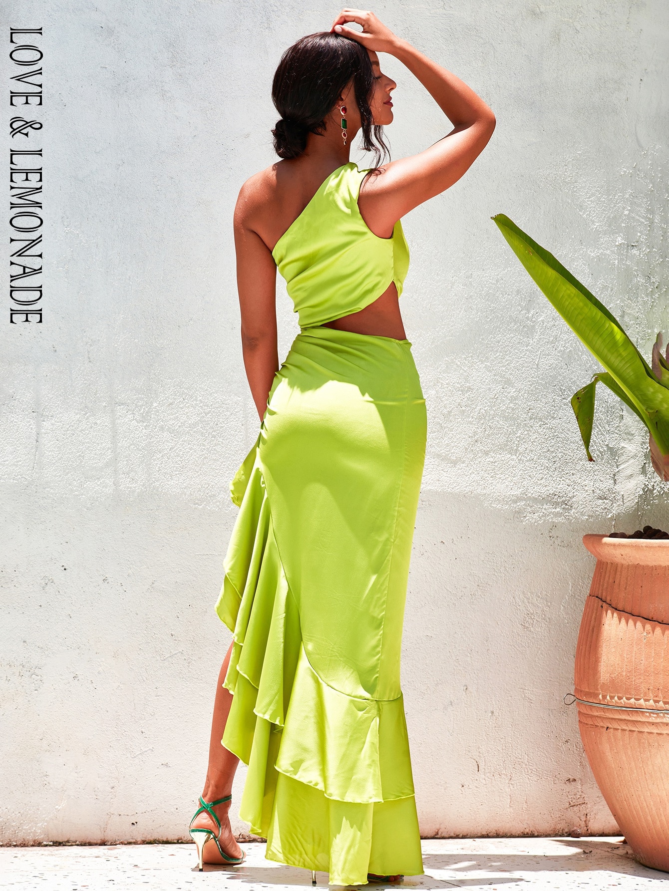 LOVE&LEMONADE Sexy Bright Green Off-The-Shoulder Cutout Ruffled Reflective Satin Party Maxi Dress LM82202-A