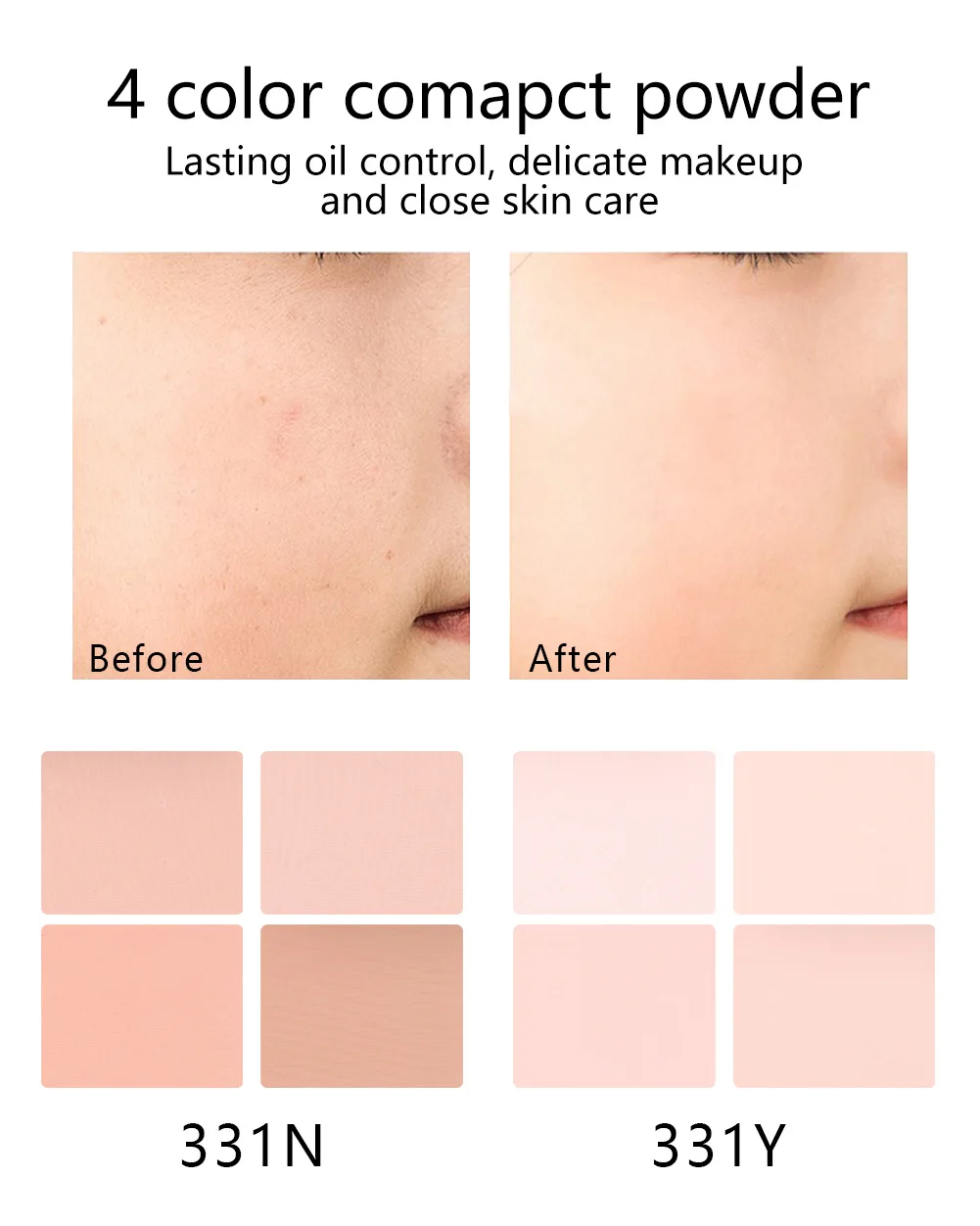 3. 4 color compact powder. Long lasting oil control, delicate makeup and close skin care, removing wrinkles and tighten your cheeks.