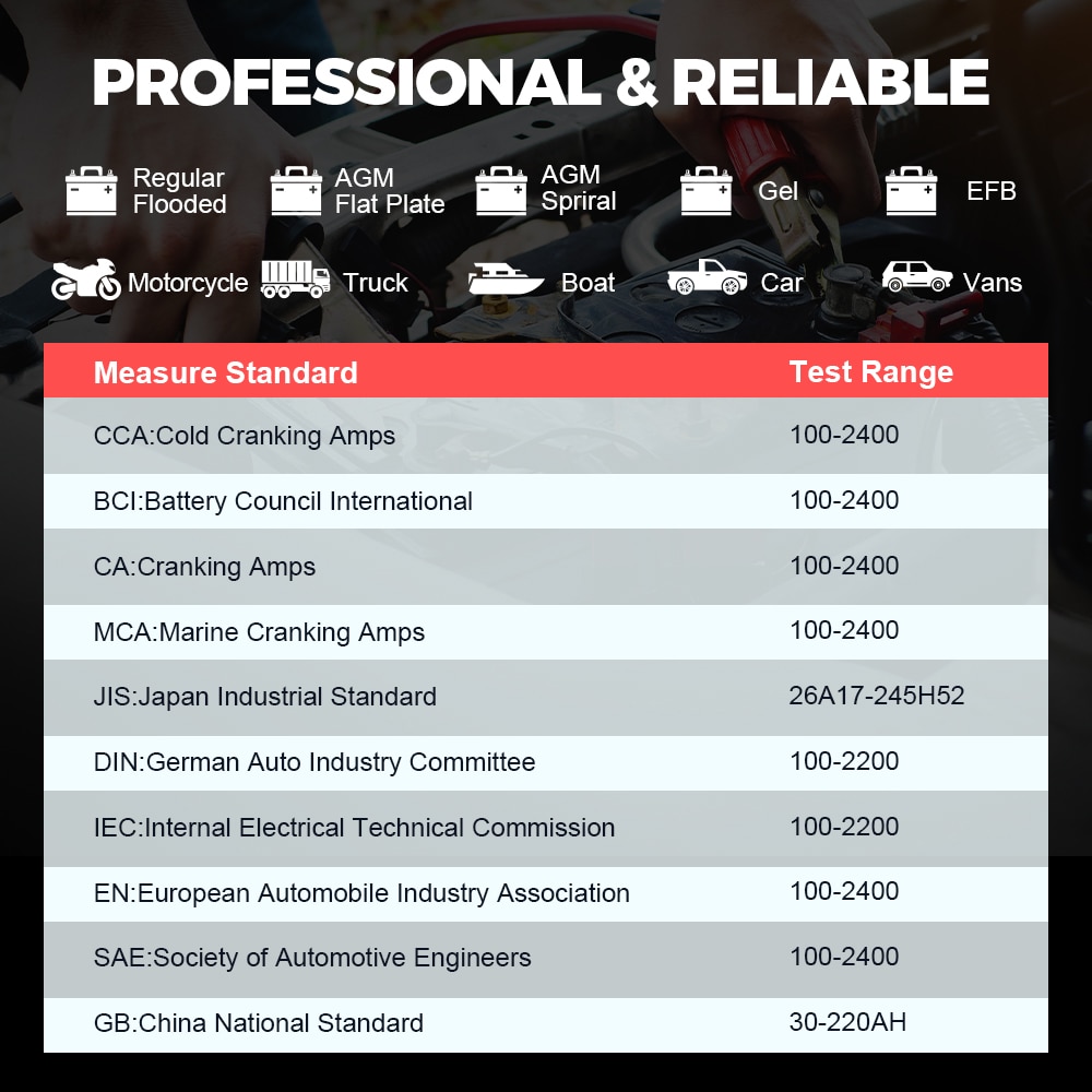 Use to test a wide range of 12V batteries (Starting [SLI], Deep Cycled and Marine) of Wet (Flooded), VRLA or Maintenance Free (MF), Sealed Maintenance Free (SMF), Absorption Glass Mat (AGM) and GEL cell. The major battery standards JIS, SAE, EN, DIN and IEC are supported.
