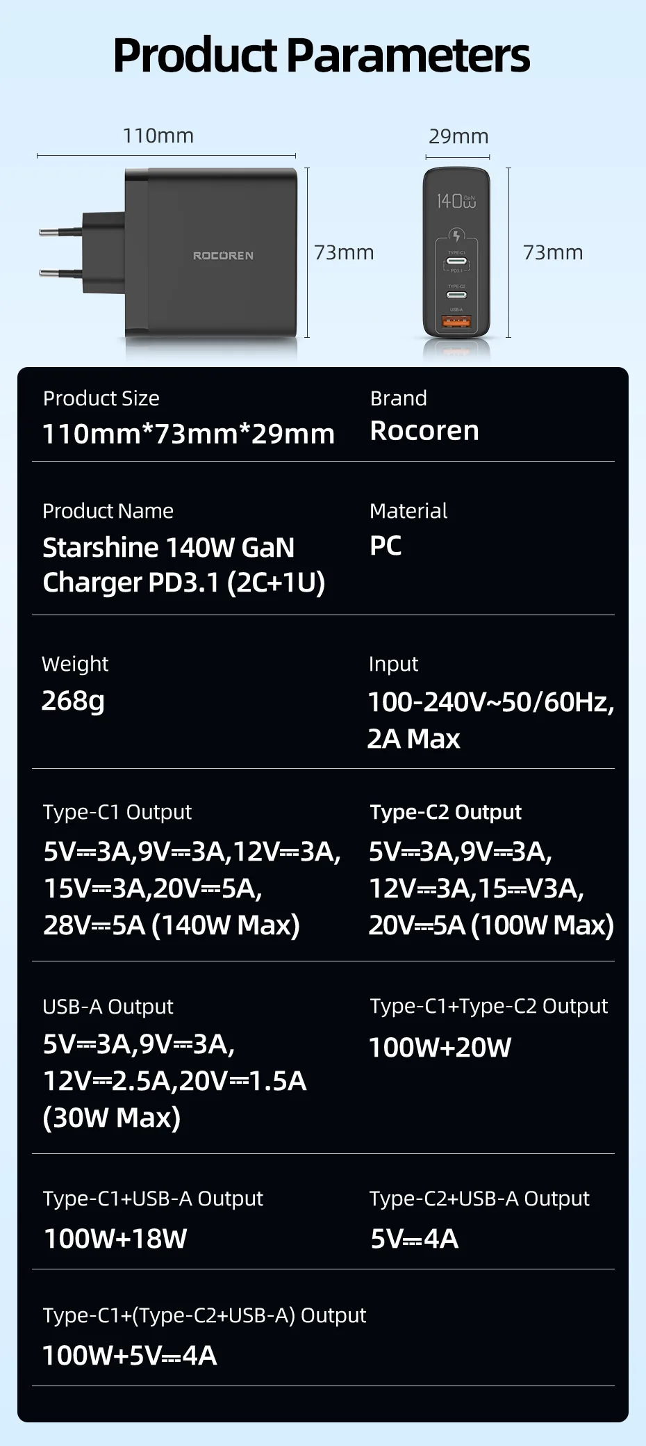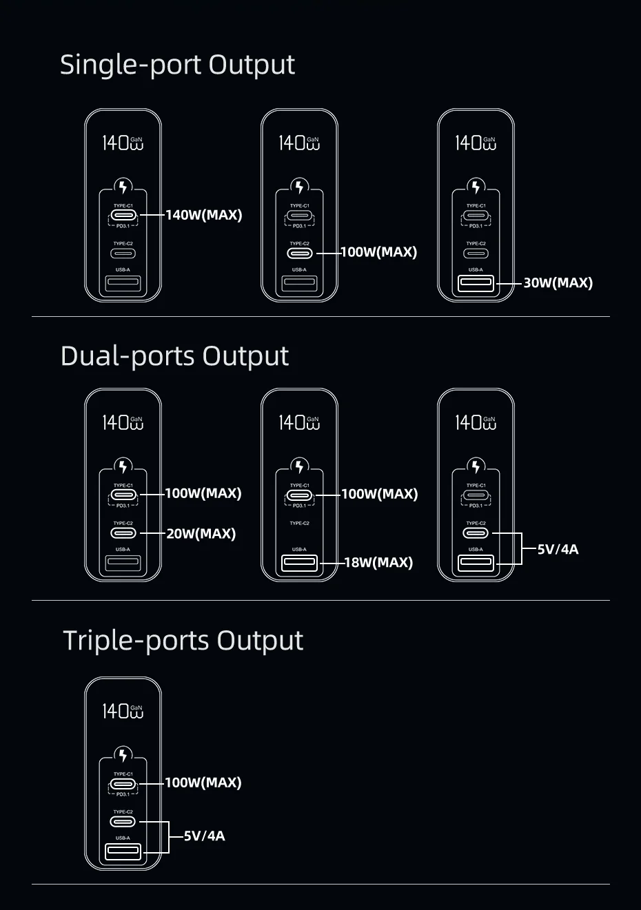 Type-C1 Output:5V⎓3A,9V⎓3A,12V⎓3A,15V⎓3A,20V⎓5A,28V⎓5A (140W Max)