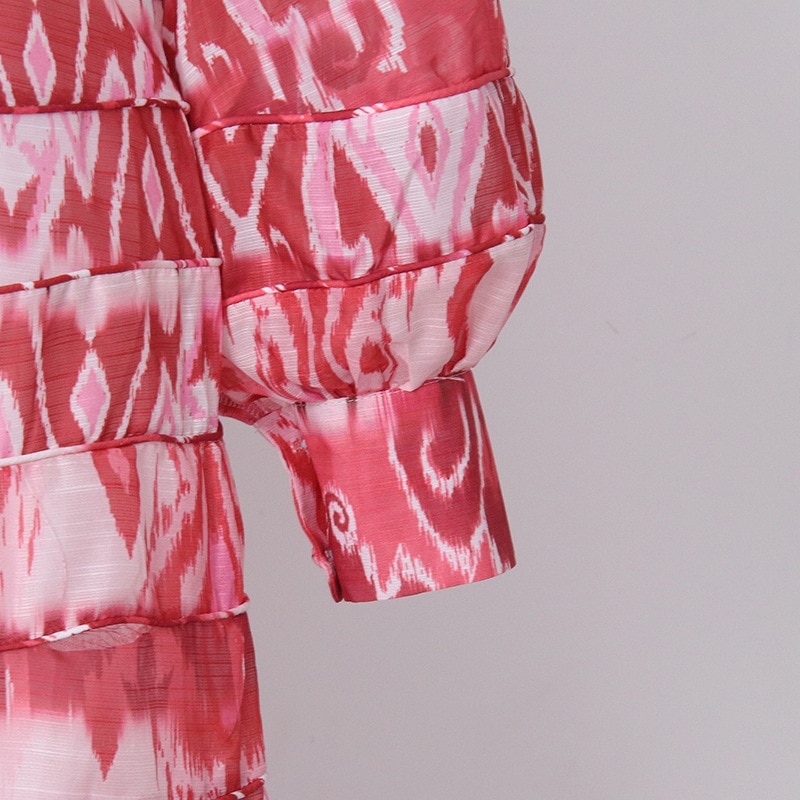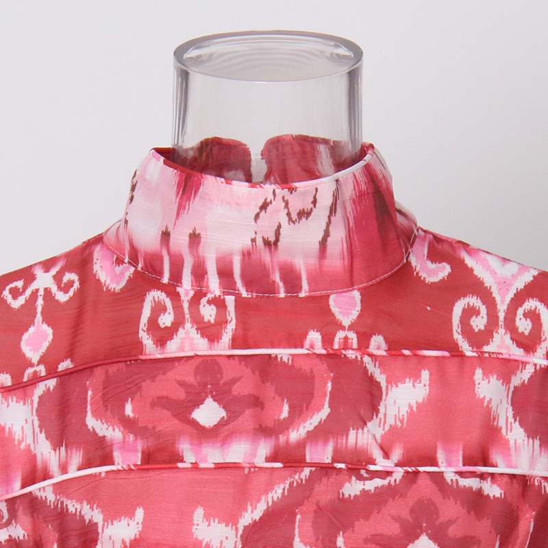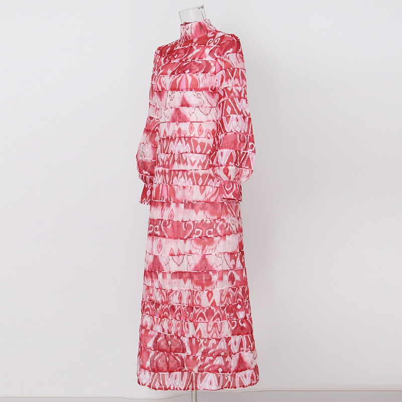 Retro Print Design Long Summer Dress 2023 Spring New Fashion Semi-high Collar Lantern Sleeve High Waist Dress Female Polyester