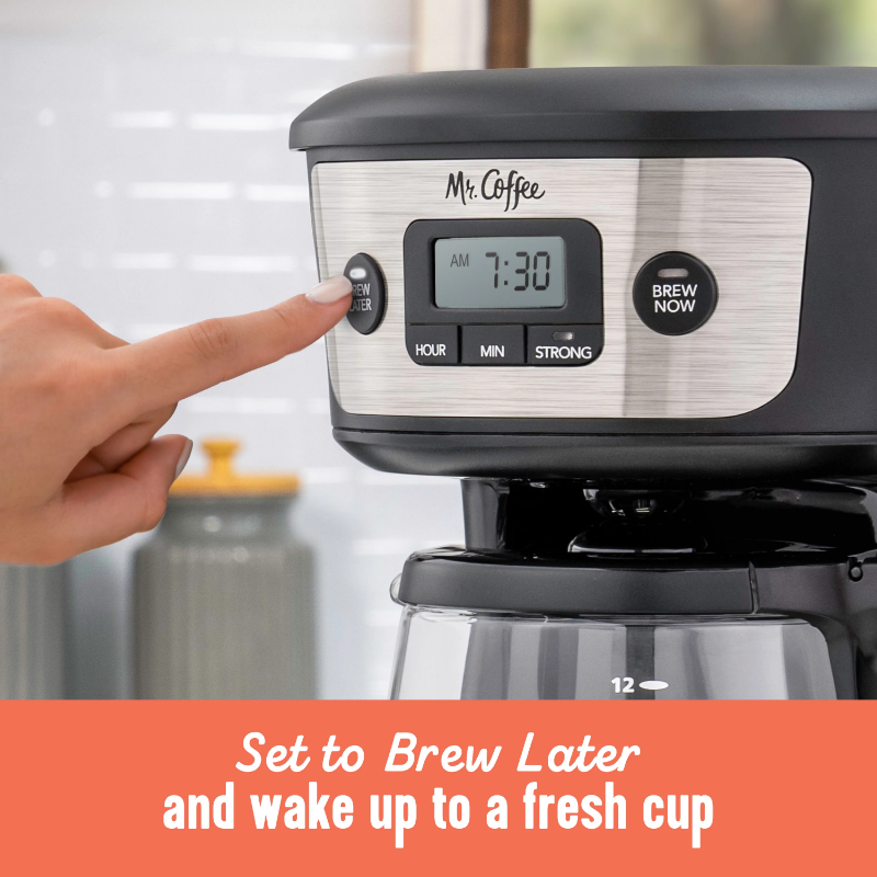 Enjoy delicious, bold-tasting coffee made simple with the new Mr. Coffee 12-Cup Programmable Coffee Maker with Strong Brew Selector. Brew your coffee as bold as you like it with the Strong Brew Selector-you can choose to brew a bolder cup of coffee if that's what you'd like, with the touch of a button. The coffee maker also features intuitive Brew Later programming that makes it easy to schedule brewing ahead of time, so you can wake up to the smell of freshly made coffee. This updated design also includes a Grab-a-Cup Auto Pause, so you can pour a cup of coffee before brewing is finished. Plus, the 4-Hour Auto-Shutoff feature automatically turns off the coffee maker so you don't have to. Just sit back, sip, and enjoy great coffee just the way you like it.
