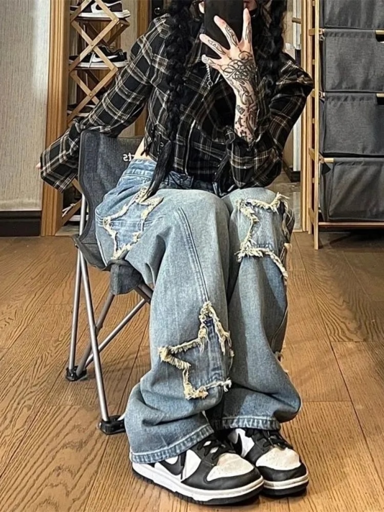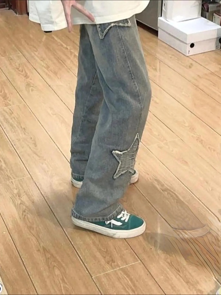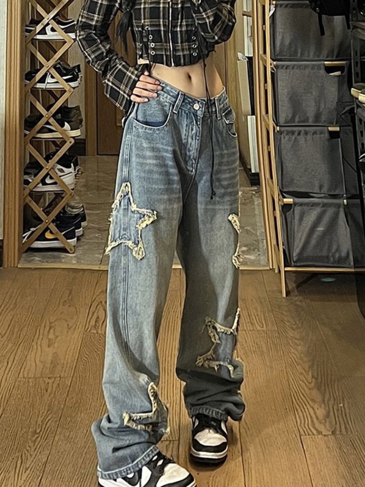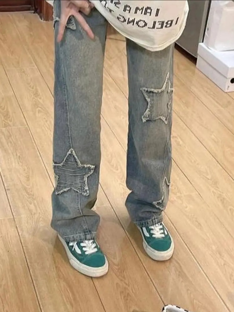 Y2K Vintage Women Korean Streetwear Oversized Star Aesthetic Straight Trousers Wide Leg Jeans Grunge Hip Hop Denim Pants Clothes