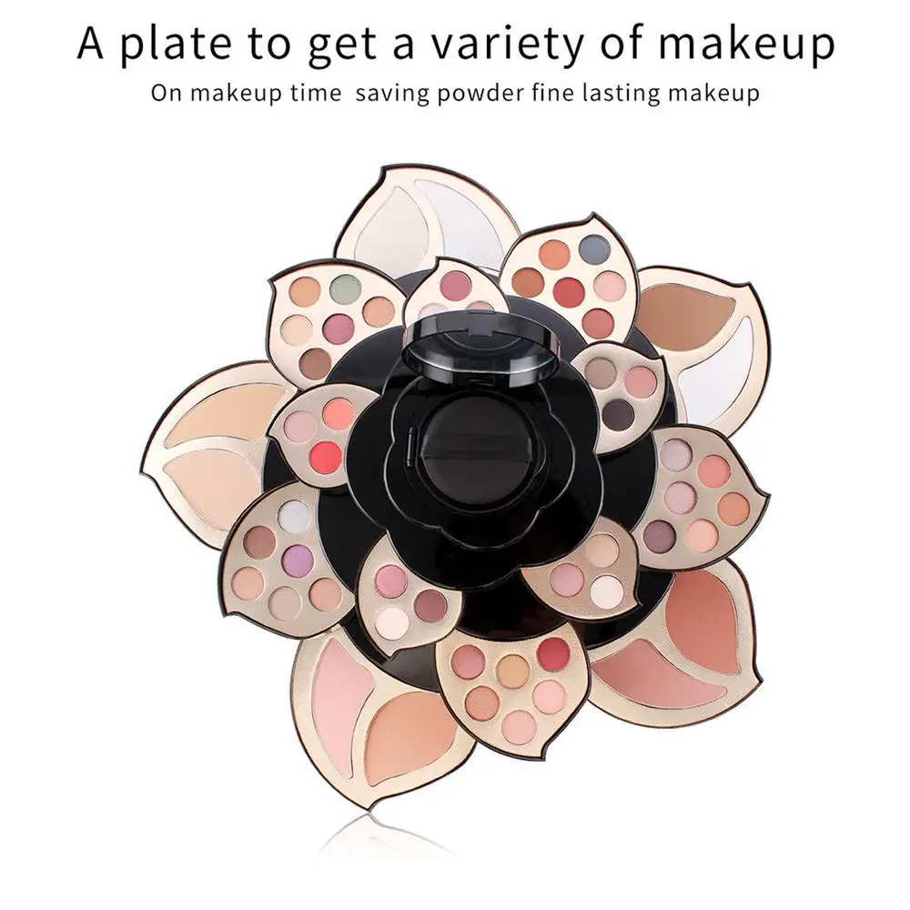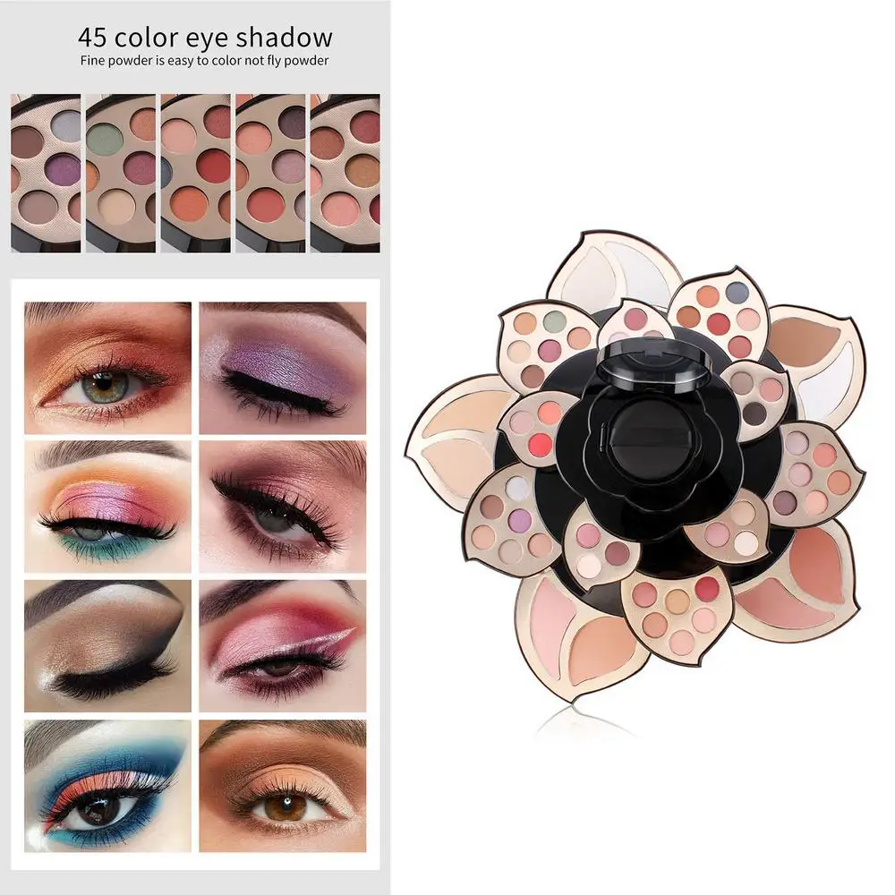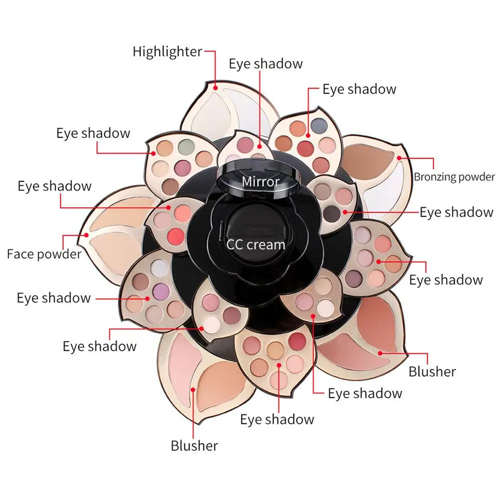 The all-in-one makeup kit contains highlighters, 45-color eye shadows, contouring powder, blush, BB cream, etc. Our unique flower makeup palette can be expanded to reveal a 3-layer makeup tray. The soft texture of the makeup palette can help you easily create a beautiful makeup look. A perfect holiday gift for women, girls, and teens.