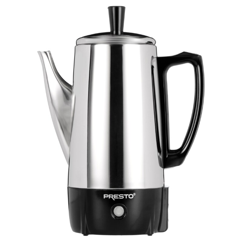Brews great coffee, hot and rich! Enjoy a refreshing brew anytime with the Presto® 6-Cup Capacity Stainless Steel Coffee Maker #02822. It makes two to six cups of delicious-tasting coffee as fast as a cup a minute, then keeps it piping hot automatically and ready to serve. This Presto® coffee maker is made of luxurious stainless steel, including the filter basket and perk tube, for easy cleaning and lasting beauty. The signal light indicates when the coffee is ready to serve. The traditional design features an easy-pour spout and stay-cool handle for elegant coffee service anytime.