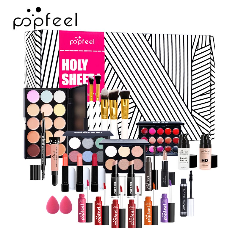 Products include: 1*cosmetic bag, 3*lipstick, 1*lipstick tray, 1*makeup primer, 1*mascara, 1*concealer tray, 2*concealer stick, 1*liquid foundation, 1*concealer, 2* Eyeshadow palette, 6*lip glaze, 1*brow cream, 1*exfoliating, 5*makeup brush, 2* , 1*eyebrow pencil
