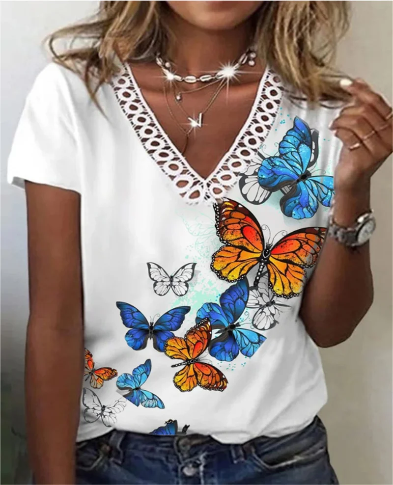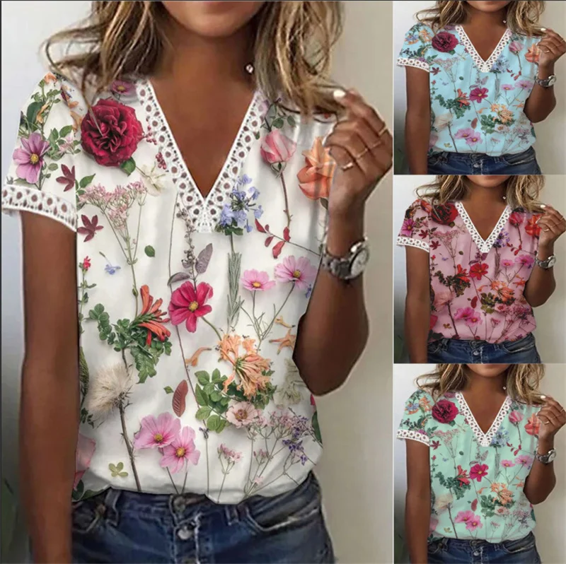 Summer Lace Splicing V Neck T-Shirt Female Elegant Print Sweet Style Short Sleeve Tops Daily Women's Pullover Loose Casual Tees
