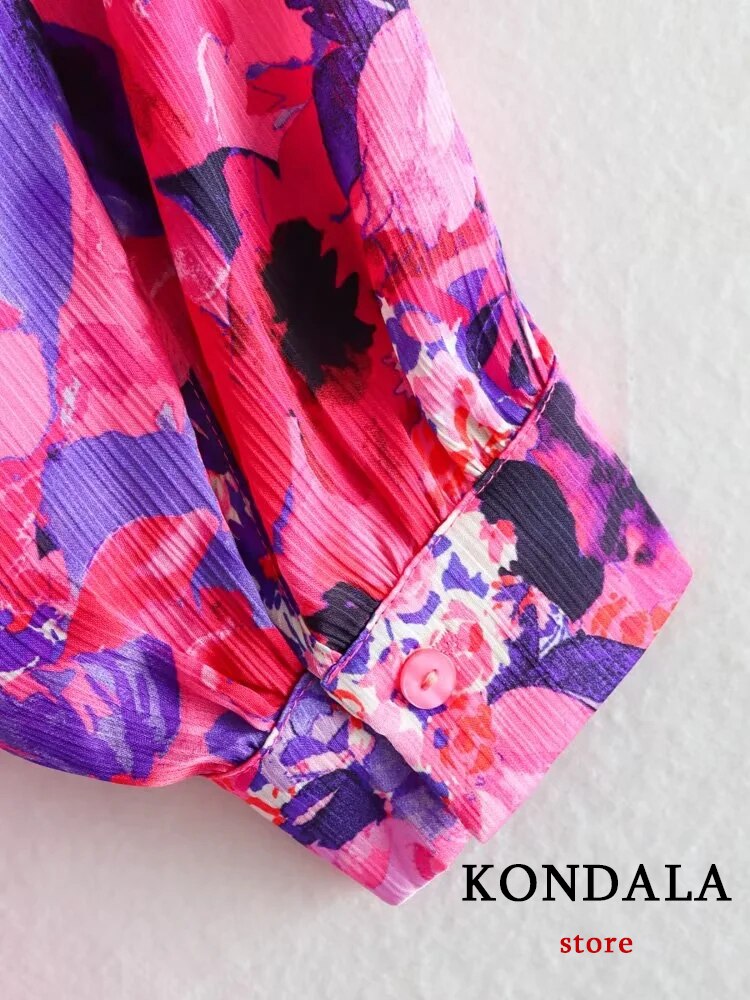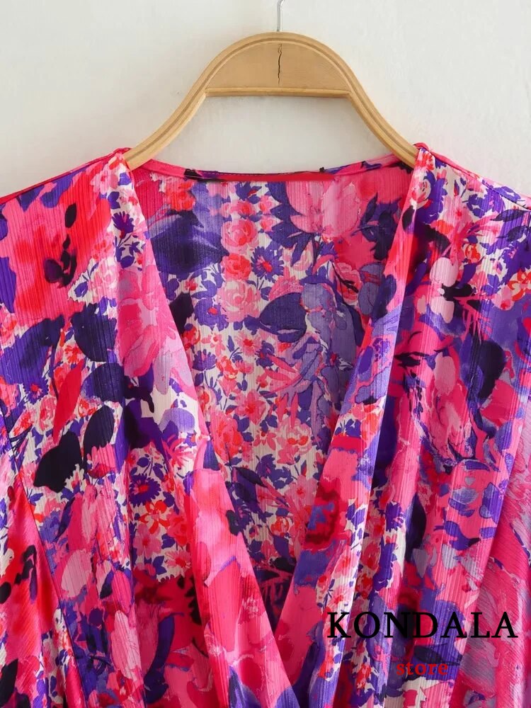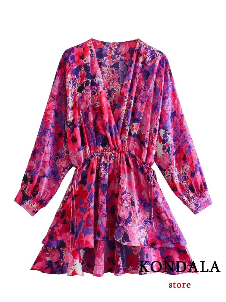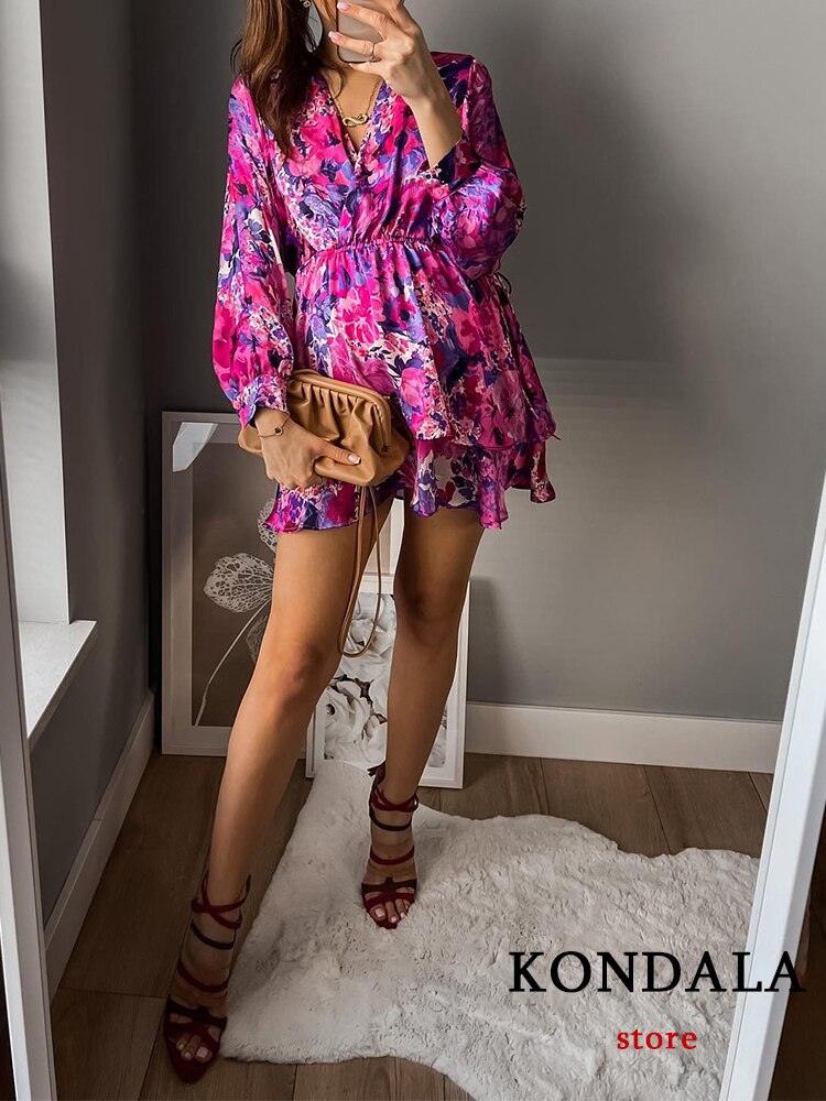 KONDALA Vintage Flower Print Ruffles Mini Dress Women V Neck Long Sleeve Satin Dress Fashion 2023 Summer Spring Holiday Dress