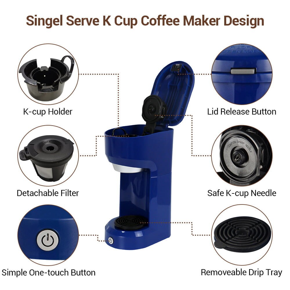 single serve coffee maker compatible with most of the k cup coffee capsule pods and is also perfect for ground coffee, a great day start with a great cup of coffee. With a 6-14oz water tank, and with a permanent filter, One-touch button makes it easy to use and brew your coffee.