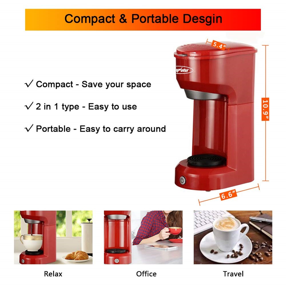 single cup coffee brewer is designed for one person.It offers you a fresh and hot 6-14 ounce cup of coffee in minutes at anytime you need it.This brewer makes having a morning cup or afternoon pick-me-up easier than ever.The stylish and compact structure is perfect for any space,such as small kitchens,dorm,meeting room or office. Compatible with most of the coffee capsule/pods, and with a permanent filter,this kind of coffee maker is perfect for ground coffee. With a 6-14oz water tank, a great day starts with a great cup of coffee.Simple one-touch button makes it easy to brew your favorite coffee. Preparing ground coffee or single cup capsules/pods, add water, press button, then auto shut-off after brewing, which ensures safety. Powerful 1000W fast brew technology ensures coffee brews quickly.Removable drip tray, suitable for most standard sized cups or larger travel mugs. Cleanup is easy, just carry out 2 or 3 circles with cold water only to clean the device before brewing the first cup of coffee or after several using times. With removable capsule shells and filter, there`s mess left about cleaning. With the most compact design and durable construction in the market, the coffee machine is perfect for home, office, apartment, caravan, etc. And it is light-weight, perfect for traveling, camping, etc. Whenever and wherever, this coffee brewers will save your time, and delivers you a delicious cup of coffee.