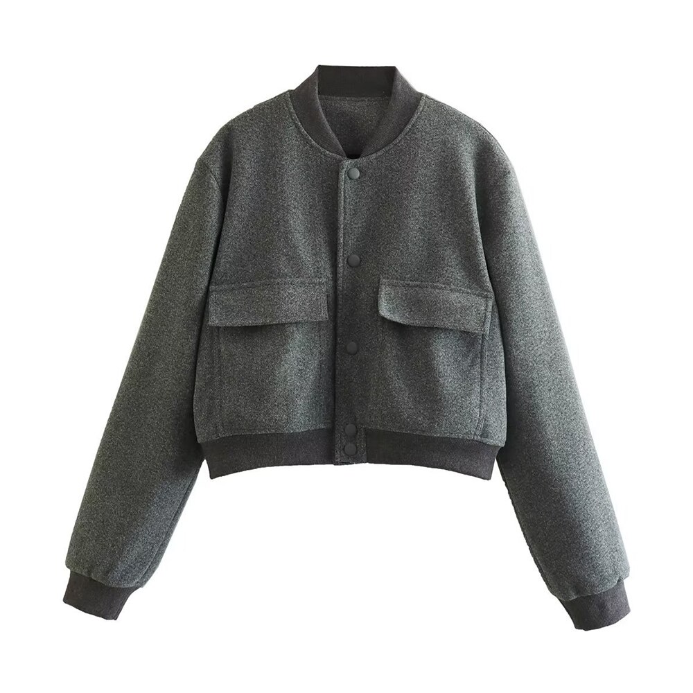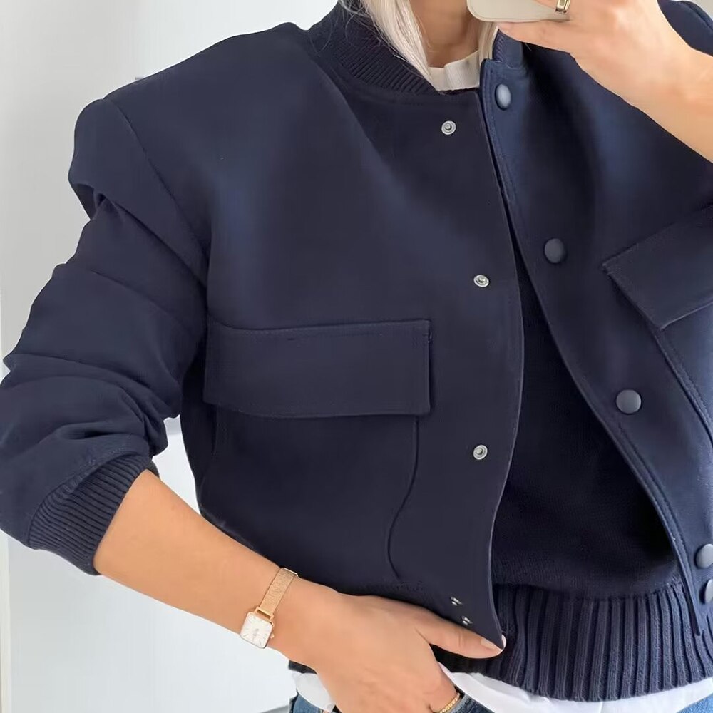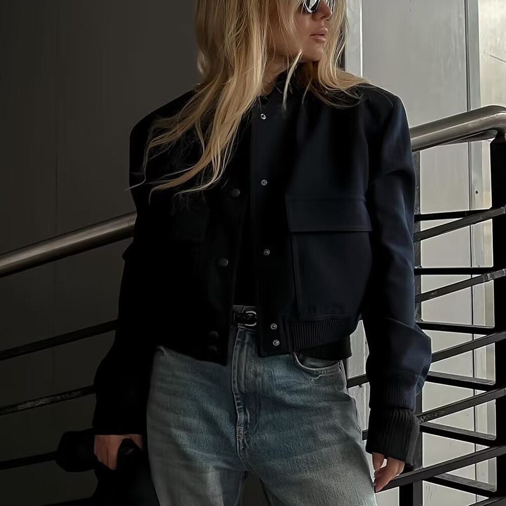 Casual Dark Blue Bomber Jacket Spring Women Fashion Single Breasted Cropped Outerwear Ladies Chic Street Pocket Coat Spring