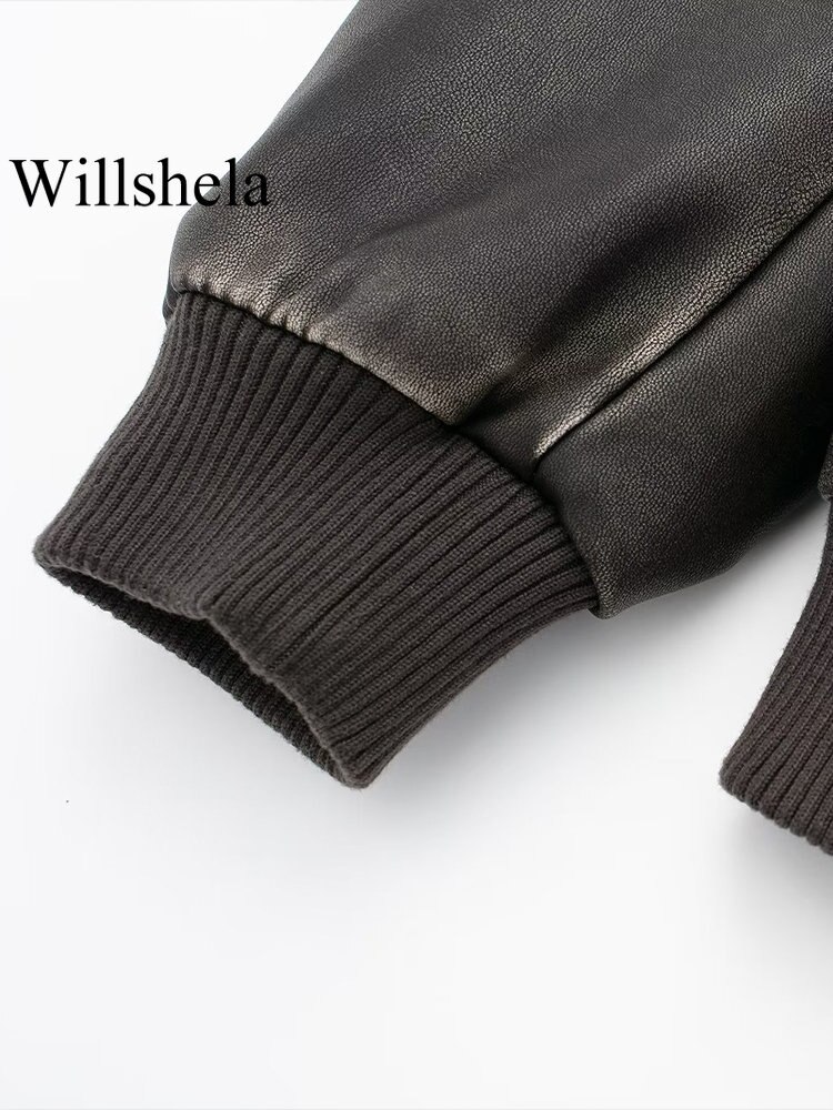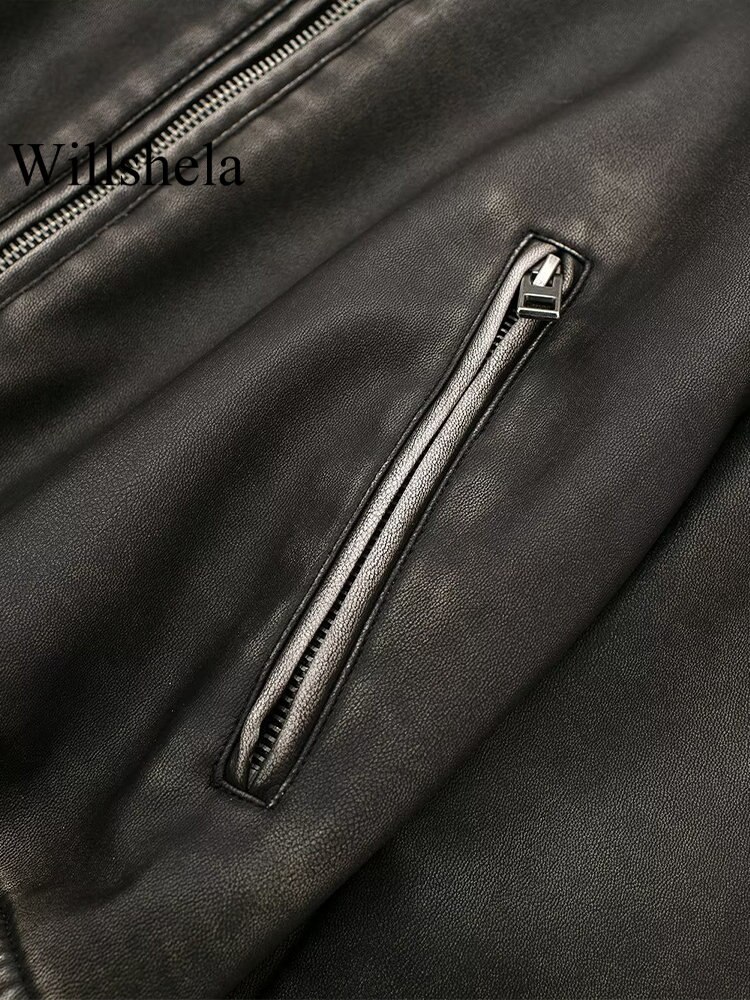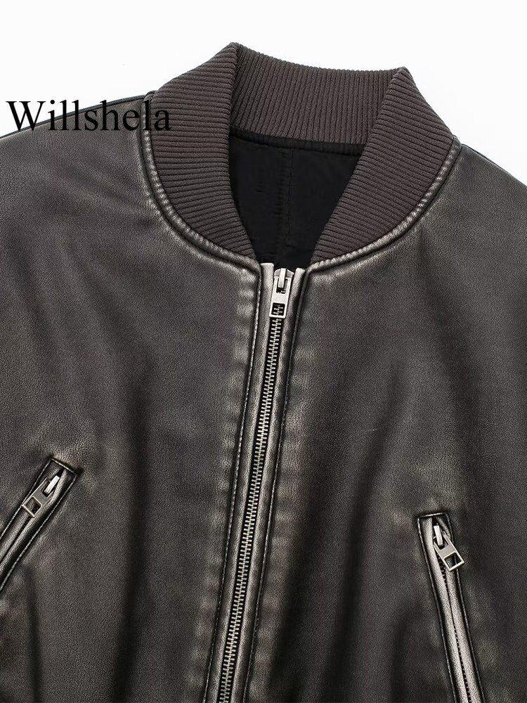 Willshela Women Fashion With Pockets Faux Leather Bomber Jacket Black Front Zipper Vintage O-Neck Long Sleeves Female Chic Lady