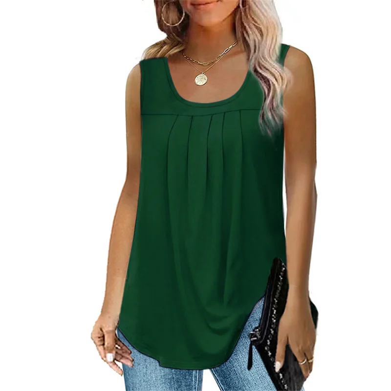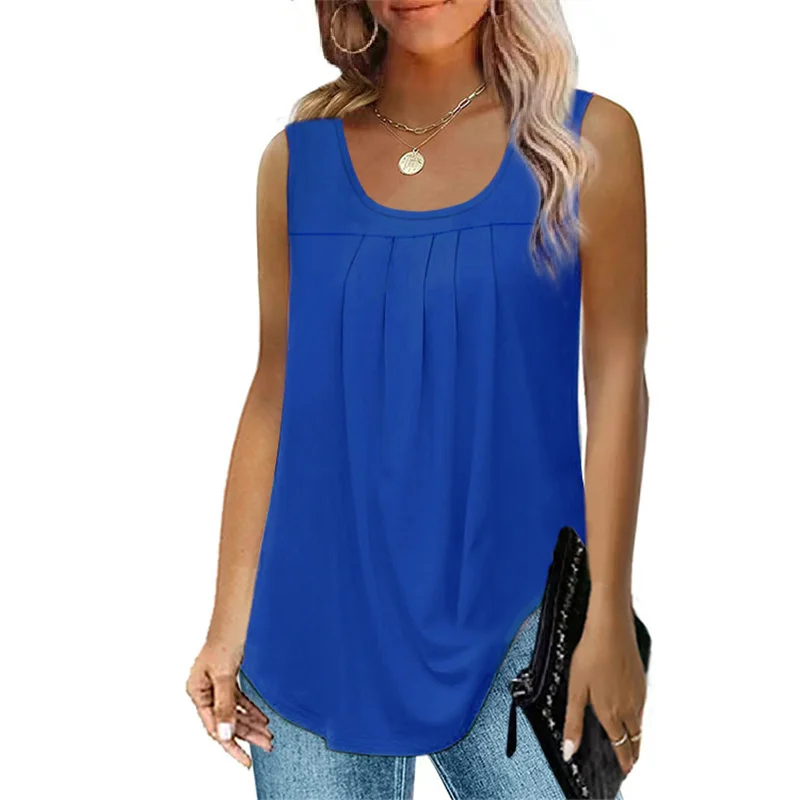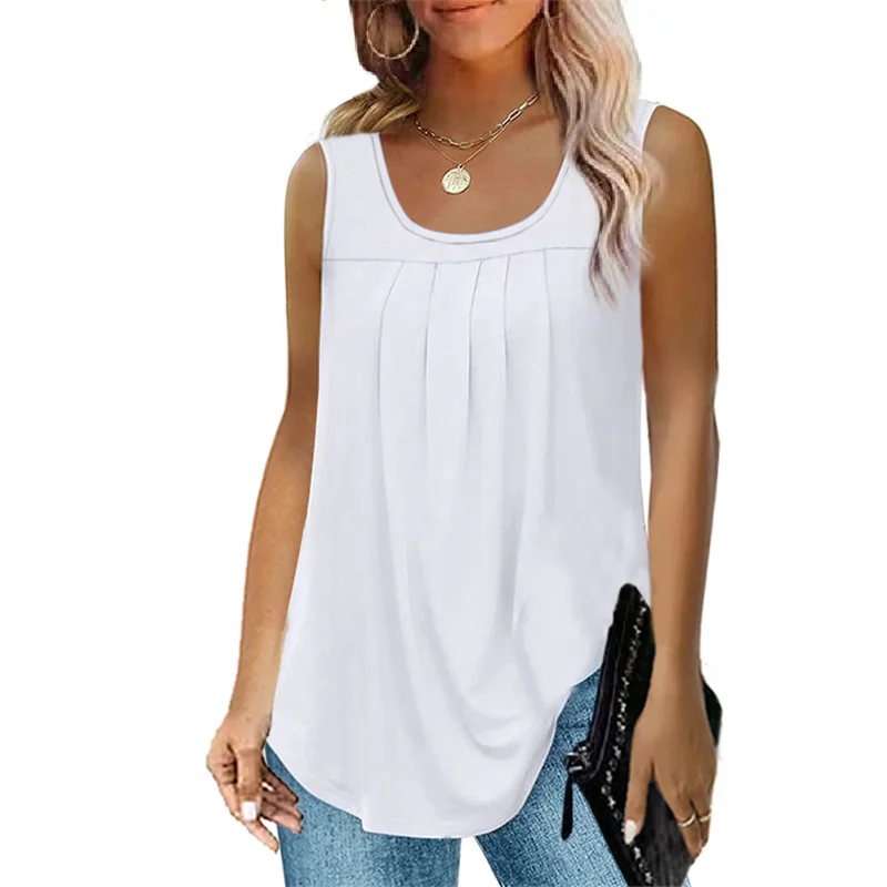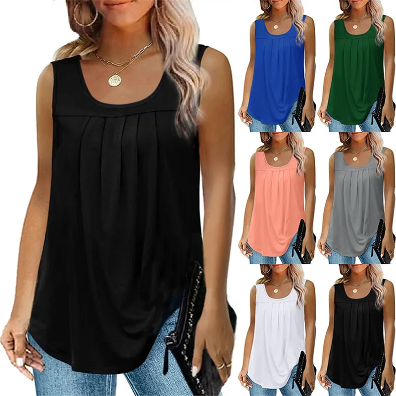 Women's Sleeveless Pleated Splice Tops Elegant Solid Color Loose Street Casual Daily Tees Female Cotton T-Shirt O Neck Vest 5XL