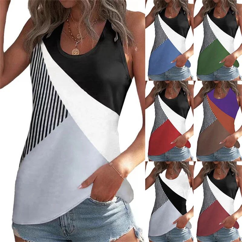 Summer Geometric Print Color Blocking T-Shirt Fashion Women's Sleeveless U Neck Cotton Tees Female Daily Casual Loose Tops Vest
