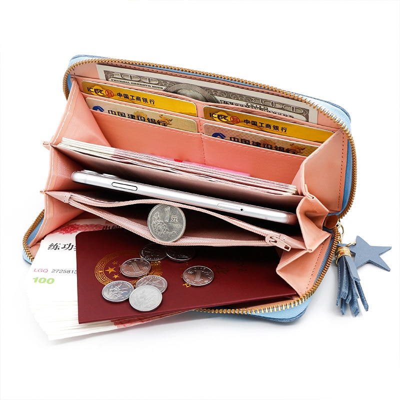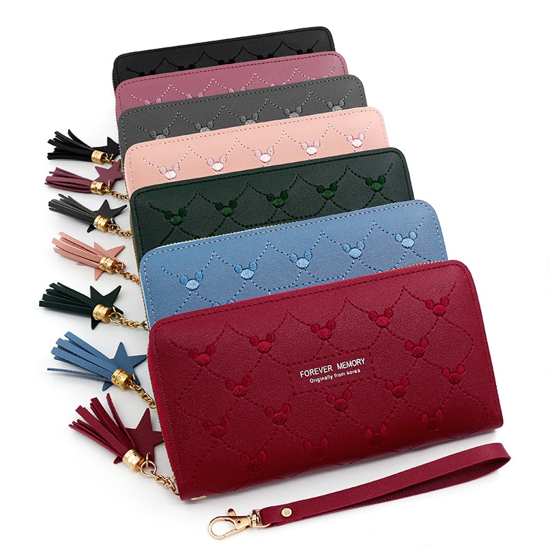 Disney Mickey Mouse Head Embroidery Wallet Multi-card ID Card Holders Women Tassel Pendant Clutch Bag Leisure Leather Purse