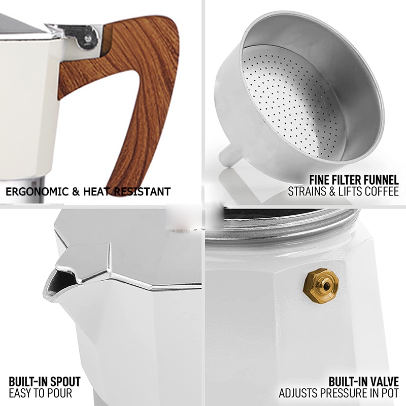 1. Makes Great Tasting Coffee: Classic Italian moka pot notorious for making the best traditional espresso quick & easy. Durable cast aluminum body with pressure valve for higher caffeine extraction and flavor. Depending on bean variety and grind selection, this espresso maker can create foam emulsion or crema. Heat resistant handle and lid knob for secure pouring.