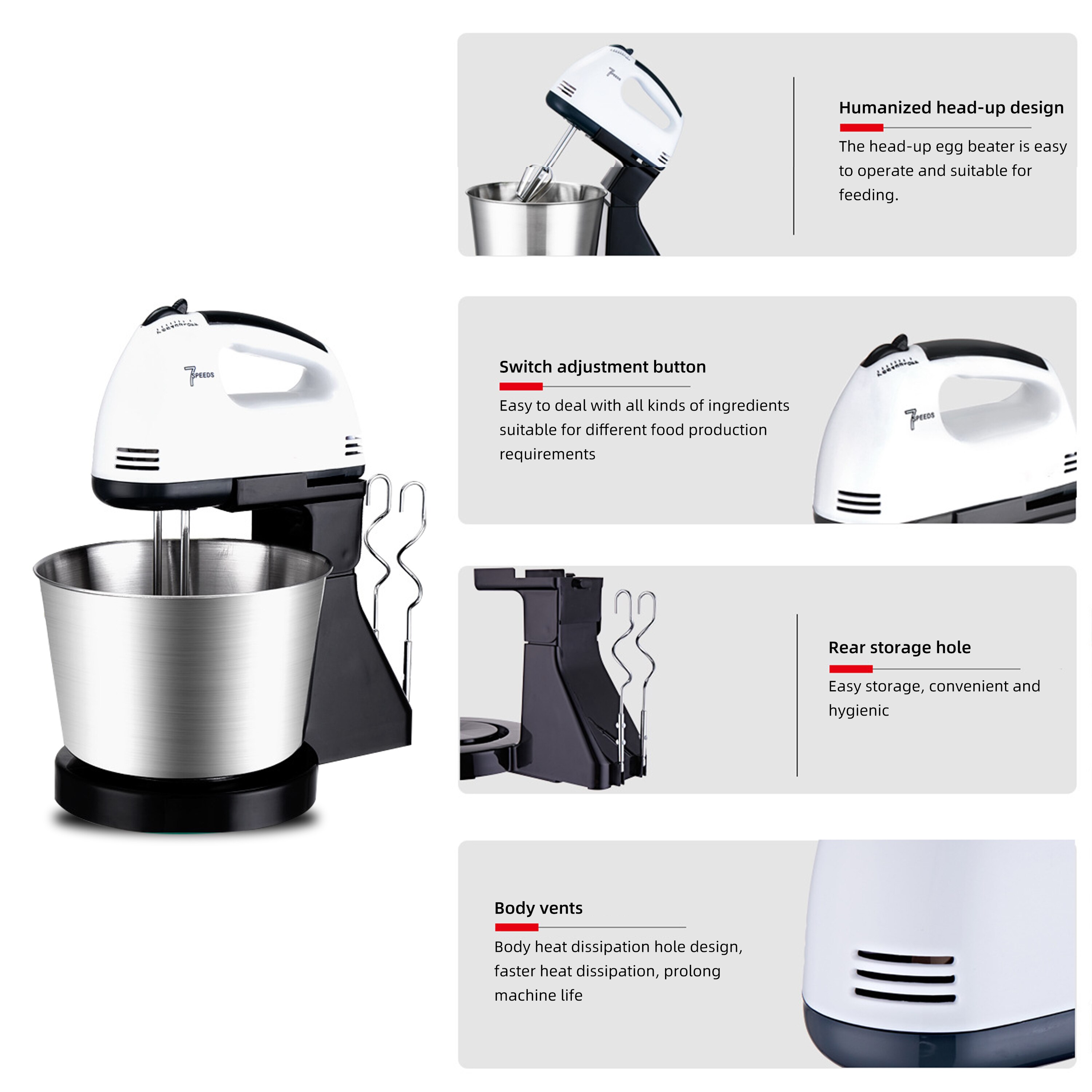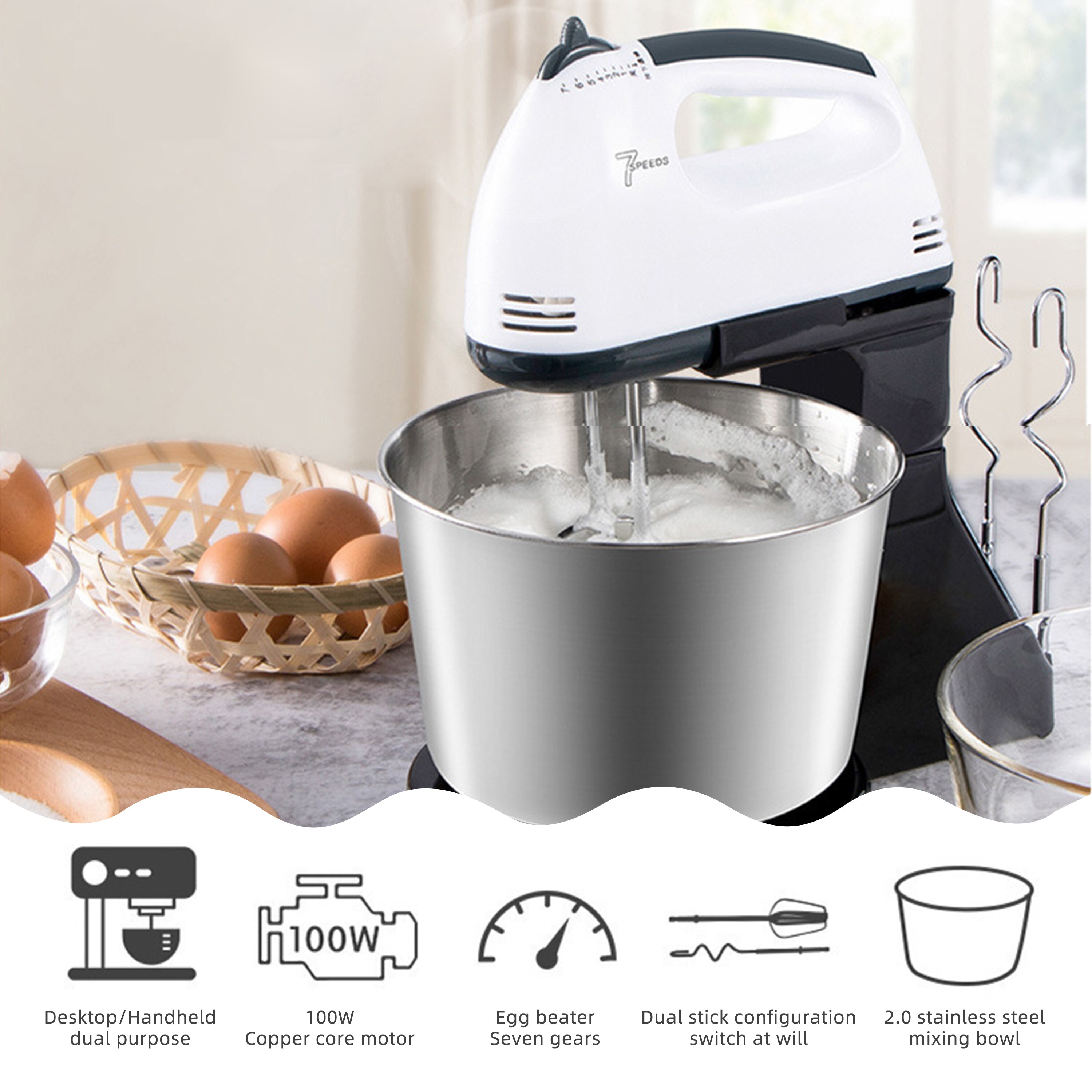 Electric Food Stand Mixer is designed for hands-free mixing for a wide variety of foods ranging from light egg whites to sticky bread dough. Featuring a 200W powerful motor, the kitchen mixer is great for all mixing needs, help you baking or cooking freely and easily.Non-slip suction cups on bottom for steady and safe use. Speed from min to max let you whisk cream, mix potatoes or knead dough for bread and etc in precise speed. This is an extremely popular mixers kitchen electric stand mixer, not only for baking lovers but also for professional chef.