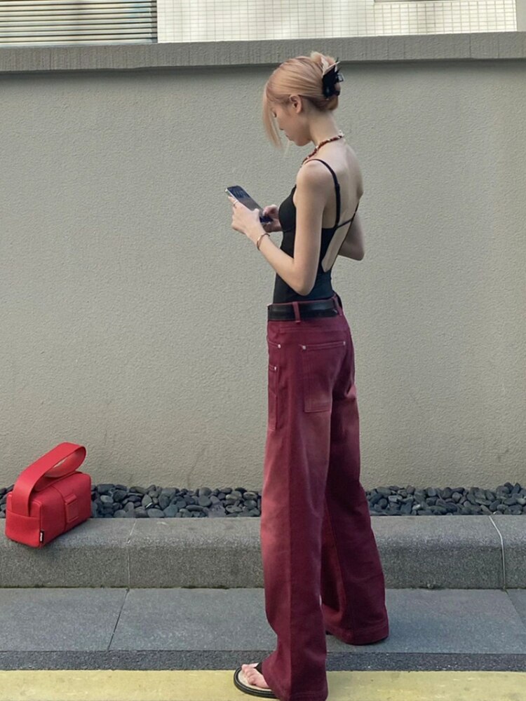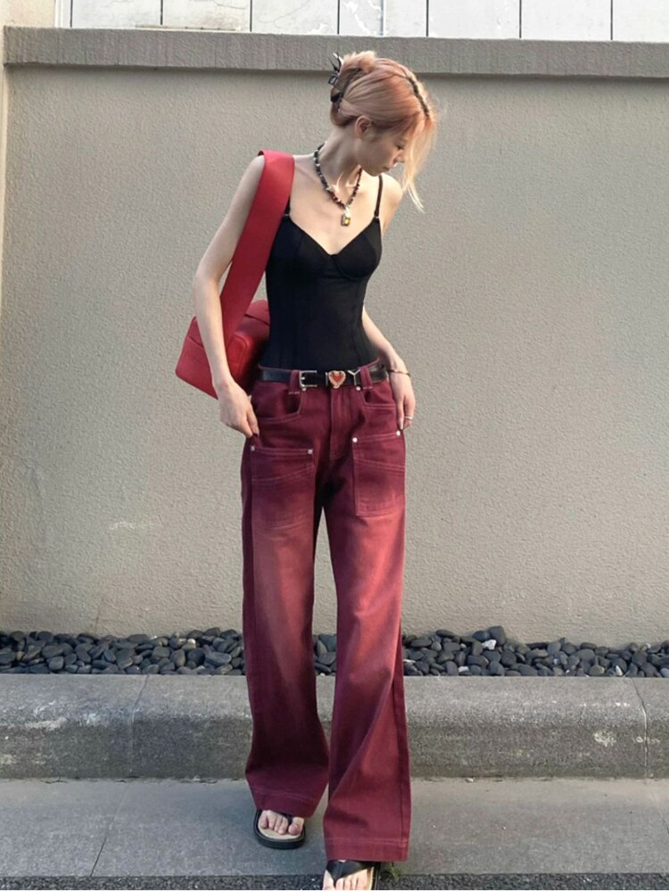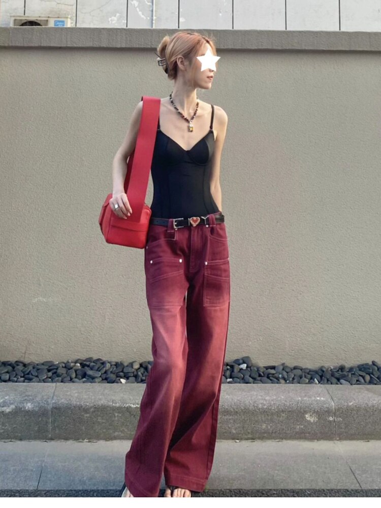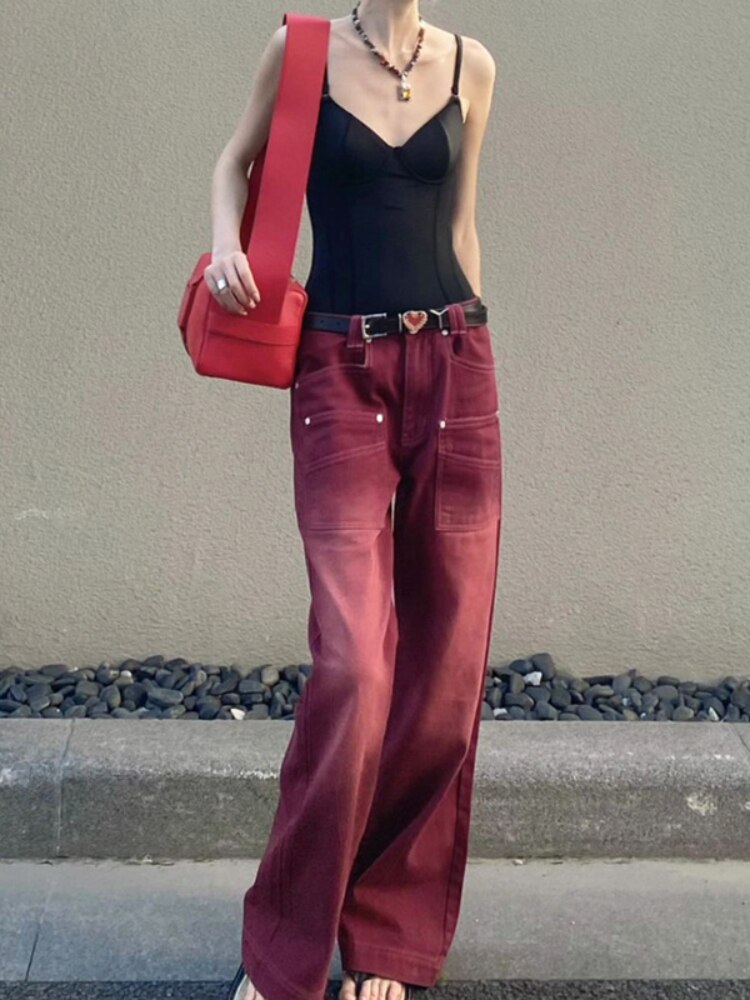Burgundy Vintage Baggy Pants Big Pocket High Waisted Long Straight Leg Trousers Streetwear y2k Jeans Joggers Korean Fashion 2023