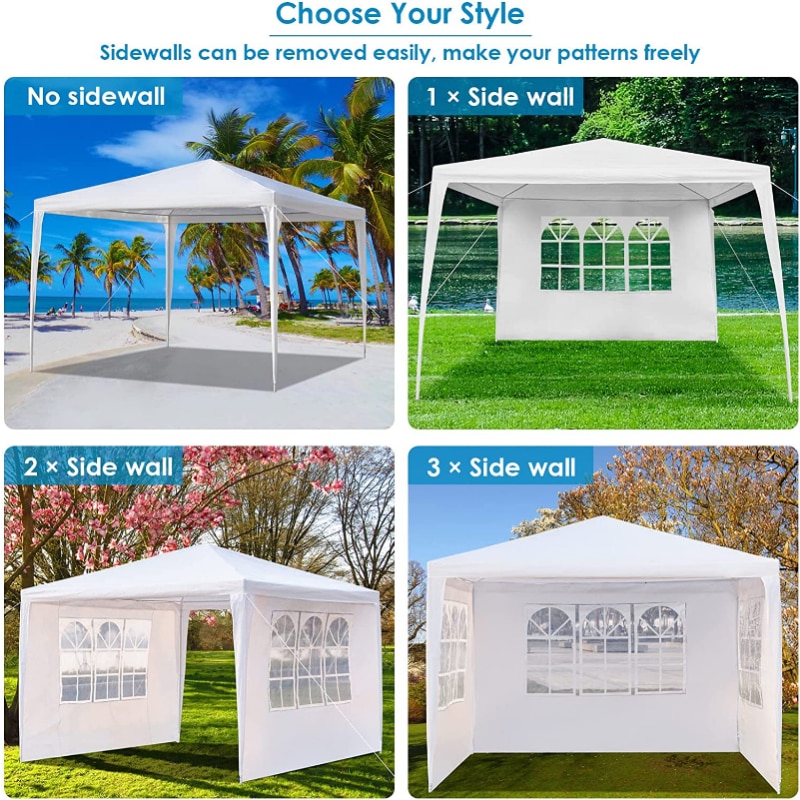 LARGE SPACE: 10x10 feet with 3 sidewalls White Wedding Party Tent provides 100 square feet of shade coverage, 6 to 10 people at the same time for any outdoor events.