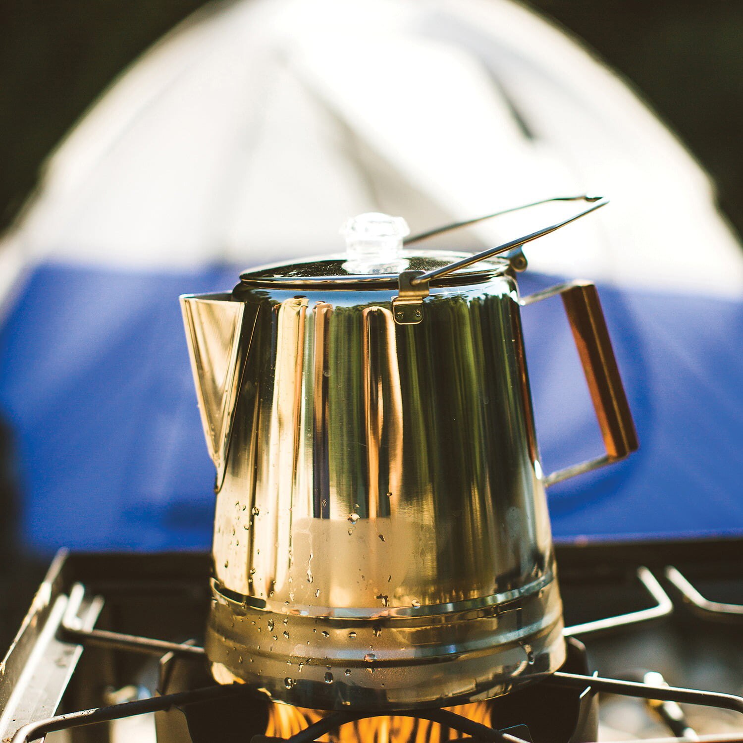 This 18 Cup Stainless Steel Percolator Coffee Pot is built around a classic design and brews up to 18 cups of coffee at a time. This model consists of a standard 3-piece stainless steel percolator system with stem and basket included. The wooden handle is cool to the touch, making pouring a breeze. Use it with your favorite camp stove or on a grill rack over an open fire.