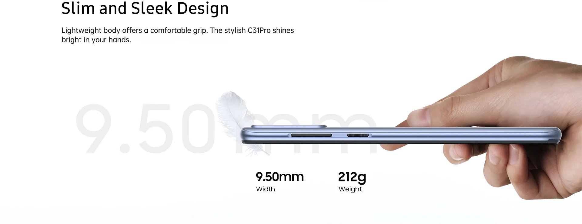 C31 Pro Size:  Height 165.2mm * Width 77.67mm * Thickness: 9.5mm  /  Weight:212g