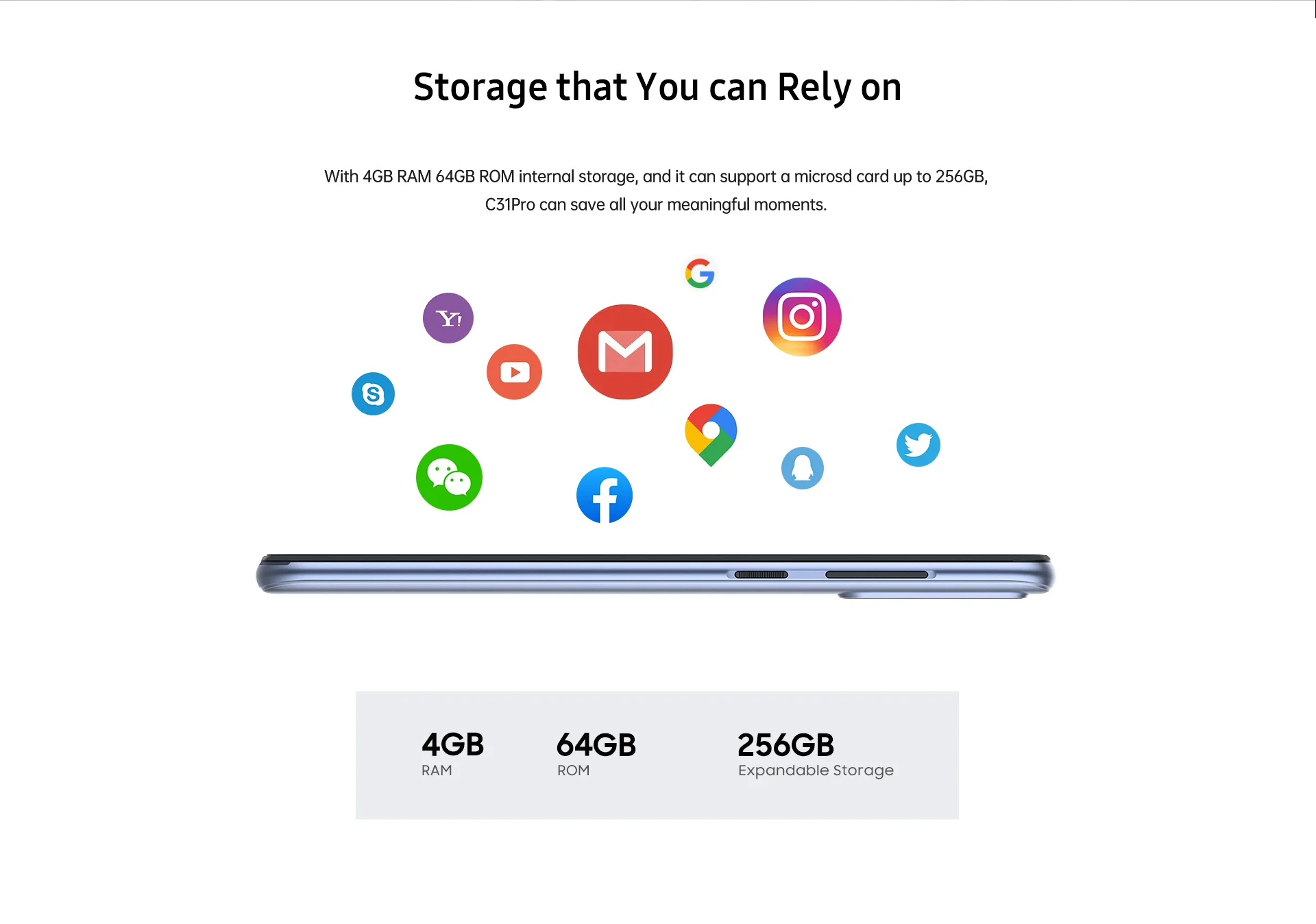 With 4GB RAM & 64GB ROM internal storage, and it supports a microSD card up to 256GB, C31 Pro can save all your meaningful moments.