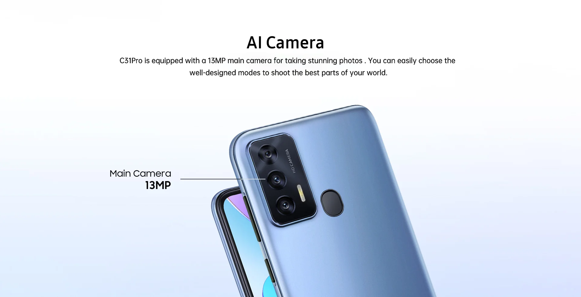 C31 Pro is equipped with a 13MP main rear camera for taking stunning photos. You can easily choose the well-designed modes to shoot the best parts of your world.