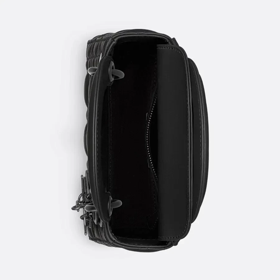 Thiết kế túi kiểu dáng nhỏ nhắn, sang trọng nổi bật với những chiếc charm kim loại chữ "DIOR" mạ cùng tông màu đen làm nổi bật tổng thể. Với dây đeo vai dạng chuối phôi da có thể tháo rời, chiếc túi Lady Dior thu nhỏ này có thể cầm tay hoặc đeo chéo như một người bạn đồng hành lý tưởng cho mọi trang phục.
